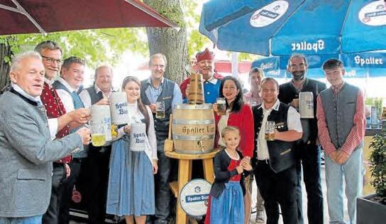 Brauereichef Thomas Schneider und Gattin Jutta Schneider, mit dem Kirchweihausschuss, den Festwirten Gerhard und Andreas Widmann, sowie Gästen beim gemeinsamen Prosit nach dem Bieranstich Fotos: Heinz Bosch