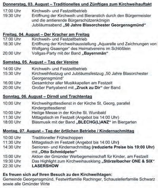 Die Störzelbacher sowie einem großen Abschlussfeuerwerk. Auch Festwirt Christian Gruber, der den Betrieb von seinem Vater übernommen hat, hatin seinem Festzelt wieder ein buntes Programm vorbereitet. Neu ist hier der Biergarten mit Tentickle-Zelt. Zum Programm zählen unter anderem der Rock n Roll und BoogieWoogie-Abend, Country- und Line Dance-Abend, fränkischer Heimatabend, Zaubershow und Schafkopfturnier
