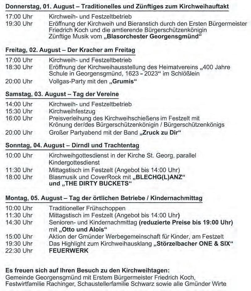 musik über Country bis zum Schlagerabend mit Stargast Achim Petry Sohn des legendären Wolfgang Petry, und einem Tag der Vereine unter dem Motto „Altmühlfranken meets Mallorca mit Stargast „Almklausi“, den Lokalmatadoren Die Störzelbacher sowie einem großen Abschlussfeuerwerk. Statt Hendl am Dienstagnachmittag wird es für die Senioren ein Kaffee-Kuchen-Angebot zu einem günstigeren Preis geben, umrahmt mit Live-Musik und der Möglichkeit, aucheinmal das Tanzbein zu schwingen und das große Los beider Tombola zu ziehen.