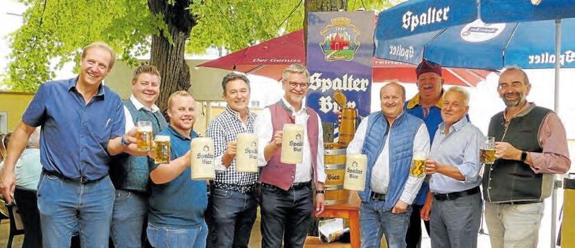 Gunzenhausen (JF). Nachdem Erster Bürgermeister Karl-Heinz Fitz am vergangenen Mittwoch um Highnoon zahlreiche Ehrengäste auf der Sonnenterrasse im Posthotel Arnold begrüßt hatte hierunter Vertreter aus Politik, Stadtrat und Ortssprecher, Kirche, Handel und Banken, Stadt und Bauhof sowie Rettungsorganisationen und natürlich auch die Organisatoren Wolfgang Eckerlein und Annette Wagner Moderator Georg KarlZanzinger durfte ebenso nicht fehlen wie die Vertreter der Stadtbrauerei Spalt und natürlich Gambrinus Klaus Carl Kraus sowie die Kerwabuam und -madli – ging es dem eigentlichen Grund der Zusammenkunft an den Hals: dem traditionellen Bieranstich des neuen Kerwabiers Mit nur einem einzigen Hieb schlug er gekonnt den Hahn ins Fass und dann hieß es: O’zapft is! Und das 2024er Kerwabier der Spalter Brauerei kann sich durchaus trinken lassen. Darüber waren sich auch die rund 60 Gäste einig. Ein bisschen malzbetonter und süffiger als das normale Bier, aber so muss das sein, betonten Brauerei-Chef Udo Weingart und Braumeister Stefan Herz. Leider konnten Festplatzorganisatoren Sabrina und Timo Zöllner und Festwirtsfamilie Gruber aufgrund Platz-Umzugsfahrten nicht teilnehmen ebenso wie die erkrankte Bierkönigin Johanna Merkenschlager Nichtsdestotrotz laufen die Vorbereitungen auf Hochtouren. Festwirt Papert gab auch schon einen kleinen Ausblick auf das Programm im Festzelt: Die Besucher erwartet ein täglich wechselndes Programm an Top-Bands von regionaler Blas-