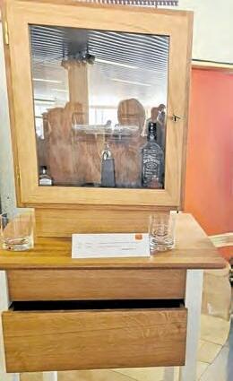 Heiko Wenk aus Arberg hat seine Ausbildung bei der Schreinerei Ortner in Aha absolviert. Multifunktional ist sein Gesellenstück aus Eiche (geölt) und weiß lackierten Füßen: Der obere verglaste Barschrank ist abnehmbar, dadurch entsteht ein Stehtisch mit einer Schublade. Foto: Firma Ortner