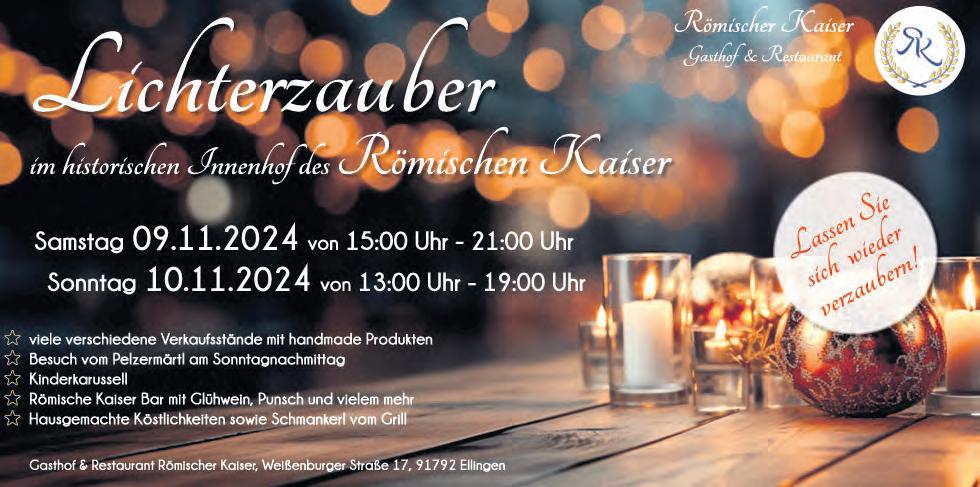 ellingen (RED). Aufgrund der tollen Rückmeldungen und der zahlreichen Besucher im letzten Jahr lädt auch dieses Jahr der Lichterzauber im Innenhof des Römischen Kaisers wieder zu einer stimmungsvollen Einstimmung auf die Vorweihnachtszeit ein! Freuen Sie sich auf zahlreiche Aussteller, die ihre liebevoll gefertigten, handgemachten Produkte präsentieren und damit die perfekte Gelegenheit bieten, besondere Geschenke für Ihre Liebsten zu finden. Erleben Sie gemütliche
