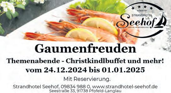 Gunzenhausen: Boccia Freizeitgruppe, Hetznerhalle, Industriestr 21, 11.30 bis 13.00 Uhr Gunzenhausen: Weihnachtsfeier BRK-Haus Albert-SchweitzerStraße 88, 14.00 Uhr Pleinfeld: Wochenmarkt, Brückenstraße, 8.30 bis 12.30 Uhr Pleinfeld: Offener Mittagstisch für Senioren (65+), Bürgerhaus, 11.30 Uhr, Anmeldung unter Tel. 091446089988 Weißenburg: Wochenmarkt, Spitalanlage, 8.00 bis 12.00 Uhr Weißenburg: Bernhard Ulrich & Fritz Scheuermann „Mei schee, scho wieda Weihnacht’n!”, Wildbadsaal, 19.30 Uhr Weißenburg: Royal Opera House Café„Der Nussknacker Kinocenter, 16.00 Uhr, Kaffee, Tee und Kuchen ab 15.00 Uhr Änderungen vorbehalten Ingolstädter Modelleisenbahn- und Spielzeugmarkt Ankauf – Verkauf – Tausch Am Sonntag, den 15. Dezember 2024, von 10.00 bis 15.00 Uhr in der Nibelungenhalle in 85098 Großmehring, am Dammweg 1 Inhaber: Norbert Westphal • Tel. (08404) 9399930, www.ingolstaedter-modellbahnmarkt.de