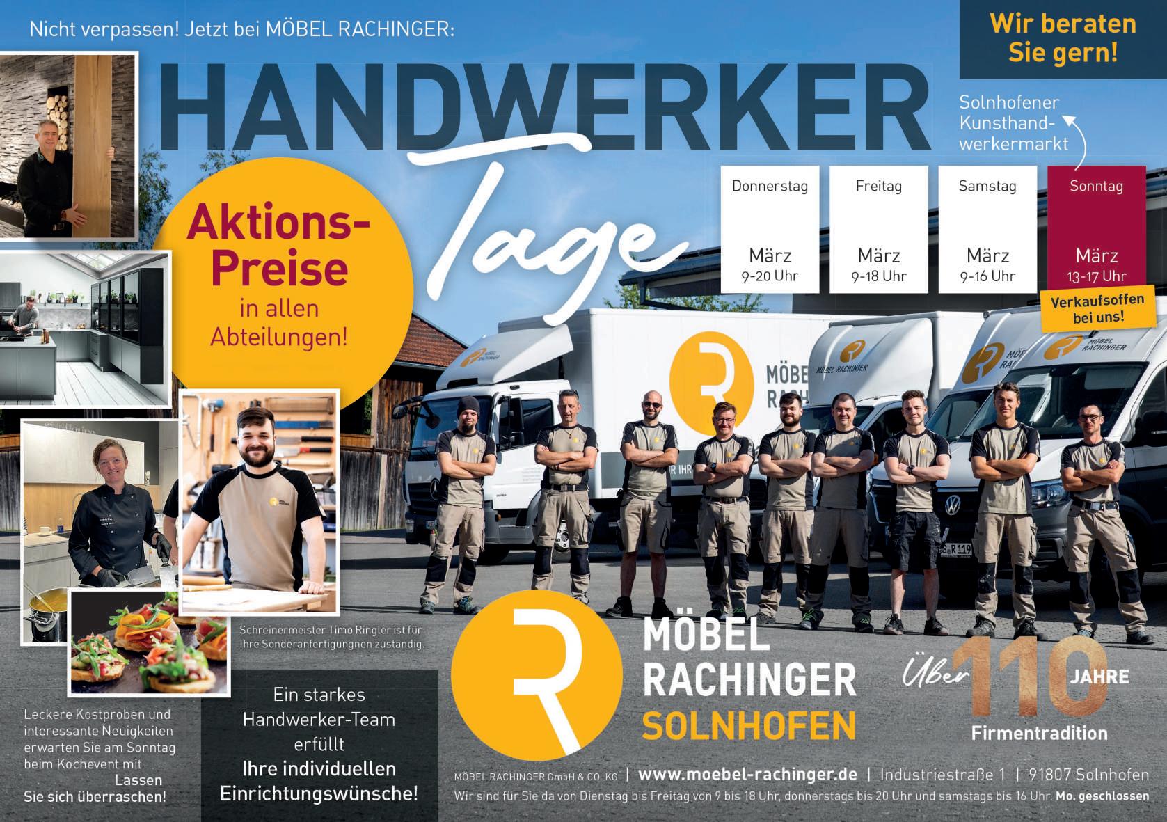 Handwerkertage bei Möbel Rachinger in Solnhofen Solnhofen (red). An den Handwerkertagen vom 6. bis 9. März 2025 gibt es bei Möbel Rachinger in Solnhofen wieder attraktive Aktionspreise in allen Abteilungen. Leckere Kostproben und interessante Neuigkeiten erwarten Sie zudem beim Kochevent mit Christina Matthes am verkaufsoffenen Sonntag, 9. März 2025. Auf über 5500 qm erleben Sie bei Möbel Rachinger die ganze Welt des Wohnens Lassen Sie sich bei einem Bummel durch unser Möbelhaus von unseren Wohnideen inspirieren. Bei uns finden Sie Wohnzimmerschränke in edlen Oberflächen aus Massivholz, furniert, lackiert, matt und Hochglanz. Sie entdecken unter den Esstischen auch wahre Platzzauberer, die mit wenigen Handgriffen zu einer großen Tafel einladen. Testen sie in aller Ruhe die verschiedensten Funktionen der gigantischen Auswahl an Couchgarnituren und TV-Sesseln. Auch bei Schlafzimmern und Küchen gibt es so einiges zu Entdecken. Ein starkes Handwerkerteam erfüllt Ihre individuellen Einrichtungswünsche Wir planen mit Ihnen und beraten Sie sehr gerne!