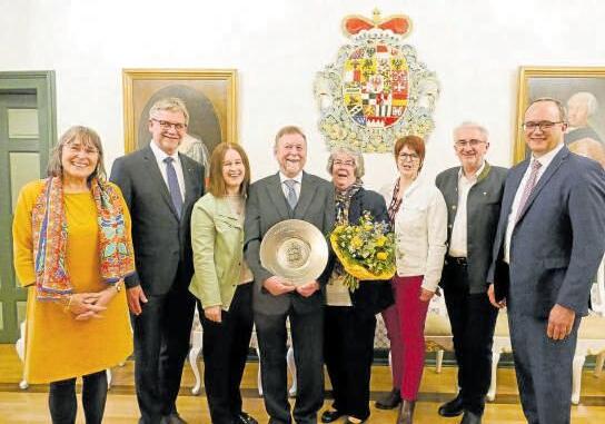 Alfred Müller erhält den Ehrenteller der Stadt Gunzenhausen. Gunzenhausen (JF). Mit ordentlich Tamtam, das der Frickenfelder Posaunenchor angestimmt hat, wurde Alfred Müller am 3. April im Markgrafensaal eine ganz besondere Ehre zuteil: Er erhielt den Ehrenteller der Stadt Gunzenhausen – und durfte sich ins Goldene Buch der Stadt eintragen. Dabei gehört Müller eigentlich zu jenen, die lieber im Hintergrund wirken, statt im Rampenlicht zu stehen – es sei denn, es geht um die Bühne Denn dort ist er seit Jahrzehnten ebenso zu Hause wie auf dem Fußballplatz, in der Zeitung oder bei einem seiner vielen Ehrenämter Alfred Müller stammt aus Kärnten, in der Nähe von Villach. Eine Schwester der Hensoltshöhe holte ihn als Haustechniker nach Gunzenhausen