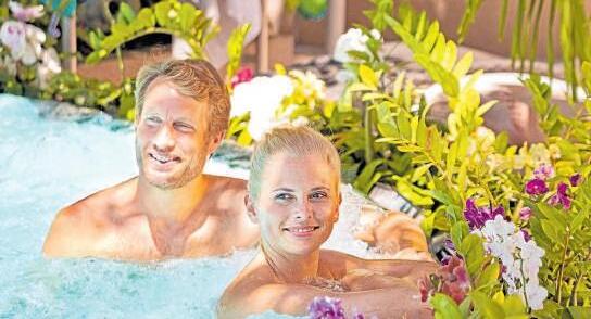 mehr als 15 thematisierten Saunaattraktionen verzaubert. In der maurischen Alhambra oder der Meditationssauna voll farbenprächtiger Kois verwöhnt das Thermen-Team Saunaliebhaber mit duftenden AufgussKreationen. Für eine frische Abkühlung nach dem gesunden Schwitzen sorgen die tosenden Wasserfälle der Felsenduschen. Anschließend entspannt es sich herrlich auf bequemen Liegen im palmengesäumten Garten Eden oder