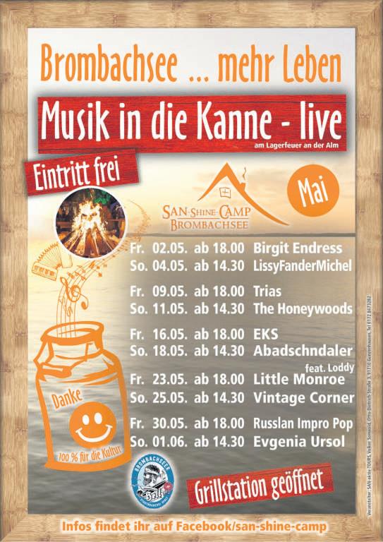 außerdem die Blasmusikformationen „Walder Dorfmusik“ und die Musikanten aus Gnotzheim sowie Worma Auch die Lokalmatadore der Gunzenhäuser Jugendkapelle und die Blechblasstars der „Blous’n“ dürfen nicht fehlen. Die Konzerte findennur bei trockener Witterung statt, aber dann helfen zahlreiche kostenlose Sitzmöglichkeiten dabei, um zwischen den individuellen Tanzeinlagen auch mal Luft zu holen. Und wer zwischendrin eine Stärkung braucht, der findet über den Marktplatz verteilt sympathische Gastronomiebetriebe die Cappuccino, isotonische Sportgetränke oder Feuerwasser verkaufen. Finanziell unterstützt werden die kostenlosen Konzerte durch die Vereinigten Sparkassen Gunzenhausen.