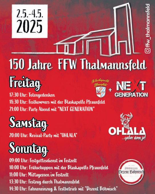 » Drei Tage buntes Programm Das Jubiläum beginnt am Freitag mit dem Totengedenken um 17.30 Uhr und anschließendem Festkommers musikalisch umrahmt von der Blaskapelle Pfraunfeld. Ab 20.00 Uhr ist Party mit „Next Generation“ angesagt. Am Samstagabend steht die Revival-Party mit OHLALA ab 20.00 Uhr auf dem Programm. Der Sonntag beginnt um 9.00 Uhr mit einem Festgottesdienst im Festzelt. Um 10.00 Uhr wird zum Frühschoppen mit der Blaskapelle Pfraunfeld und anschließendem Mittagessen eingeladen. Um 13.30 Uhr startet der Festzug durch Thalmannsfeld, der mit dem Fahneneinzug im Festzelt endet. Dort herrscht Festbetrieb mit „Dezent Böhmisch“ Zu allen Veranstaltungen ist der Eintritt frei!