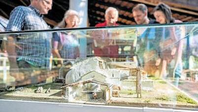 Besuchergruppe am Thermenmodell im Schutzbau der römischen Thermen Foto: Museen Weißenburg/Dietmar Denger