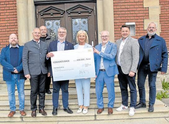 Staatsministerin übergab Scheck für Umbau des Progymnasiums Weißenburg (do). Die Handwerker arbeiten bereits fleißig, denn der Zeitplan ist sportlich: Bereits im Herbst 2026 soll der Umbau des historischen Progymnasiums in Weißenburg abgeschlossen und bezugsfertig sein. Entstehen wird ein Kinderhort mit 100 Plätzen, in den die Stadt rund neun Millionen Euro investiert. Der Freistaat Bayern unterstützt die Maßnahme mit rund 700.000 Euro Zur Übergabe des Förderbescheids kam Staatsministerin Ulrike Scharf in der vergangenen Woche höchstpersönlich vorbei. Es ist ein Glücksfall und eine Win-Win-Situation, dass wir in dem denkmalgeschützten Gebäude einen Kinderhort integrieren können“, freute sich OB Jürgen Schröppel Zudem schlage man mit dem Umbau gleich mehrere Fliegen mit einer Klappe Zum einen könne man ein leerstehendes Gebäude mitten in der Stadt einer neuen Nutzung zuführen und werde auch dem gesetzlich Anspruch für Grundschüler auf einen Hortplatz gerecht. Zudem müsse man den Umbau des 1895 erbauten Hauses das von Anfang an eine Bildungseinrichtung war, nicht alleine bezahlen. In den 17 Jahren seiner Amtszeit sei ihm das Thema Bildung immer ein großen Anliegen und ein Schwerpunkt seiner Arbeit gewesen. Es war mir wichtig, alle Bildungseinrichtungen anbieten zu können“