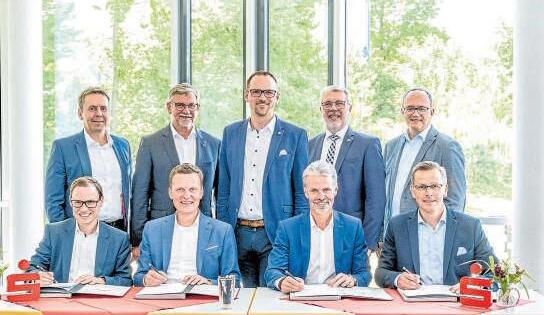 (v. l. n. r.) 1 Reihe: Vorstandsmitglied Bernd Reichert Vorstandsvorsitzender Thorsten Straubinger Stv Vorstandsvorsitzender Jürgen Pfeffer, Vorstandsmitglied Frank Sarres; 2. Reihe: Landrat Ben Schwarz, Bürgermeister KarlHeinz Fitz, Oberbürgermeister Peter Reiß, Oberbürgermeister Jürgen Schröppel, Landrat Manuel Westphal Foto: Sparkasse Mittelfranken-Süd