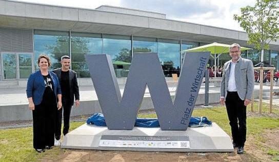 (v. r.) Bürgermeister Karl-Heinz Fitz, Alexander Herzog (Stadtmarketing) und Nicole Vierheller (WJ) enthülltendas W“ am Platz der Wirtschaft“ unterhalb der Gunzenhäuser Stadthalle, direkt an der Promenade. Foto: Brigitte Dorr