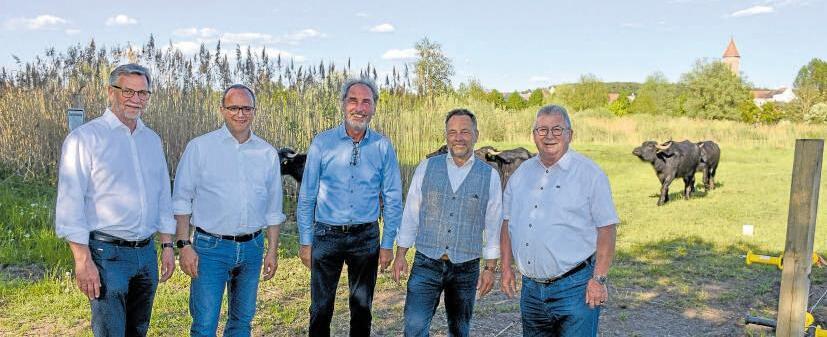 Gunzenhausen (red). Am Storchenbiotop in Gunzenhausen weiden seit Kurzem Wasserbüffel und leisten damit einen wichtigen Beitrag zum Schutz der Wiesenbrüter Landrat Manuel Westphal, Bürgermeister Karl-Heinz Fitz, Behördenleiter des Wasserwirtschaftsamtes Thomas Keller sowie der Vorsitzende des Landschaftspflegeverbands Mittelfranken Gerhard Wägemann haben sich nun bei einem gemeinsamen Vor-Ort-Termin die Beweidung, die Teil des Aktionsprogramms Wiesenbrüterschutz ist, angesehen. Fünf Wasserbüffel haben Ende April die Beweidungsfläche am Storchenbiotop, das eine staatliche Fläche des Wasserwirtschaftsamtes Ansbach ist, bezogen. Weitere Tiere des Laubenzedler Landwirts Johannes Horn sollen im Juni dazukommen. Die Fläche vor den Toren der Stadt Gunzenhausen wurde vor 35 Jahren vom Landschaftspflegeverband als Lebensraum für den Storch angelegt. Mittlerweile erfreuen sich auch andere Tiere an dem Gelände wie der immer seltener werdende Kiebitz. Durch die Beweidung soll die Pflege der Fläche vereinfacht werden, so dass ein optimaler Lebensraum für die Wiesenbrüter aber auch die hier noch anzutreffenden artenreichen Wiesenbe-