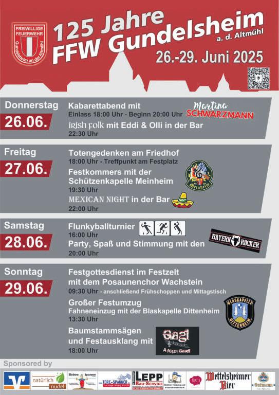 Der Sonntag, 29.06.2025, beginnt mit einem Festgottesdienst im Festzelt mit dem Posaunenchor Wachstein. Anschließend wird zum Frühschoppen und Mittagstisch eingeladen. Um 13.30 Uhr beginnt der Festumzug mit anschließendem Fahneneinzug und Festbetrieb mit der Blaskapelle Dittenheim. Um 18.00 Uhr steht noch ein großes Baumstammsägen auf dem Programm. Jedes Zweier-Team gewinnt. Es wird gegen Zeit gespielt. Auch Damen-Teams sind erwünscht. Anmeldungen im Festbüro oder vorab per E-Mail an FFW.Gundelsheim@web.de Am Abend klingt das Fest mit Gagi langsam aus » Aus der Chronik Die ausführliche Chronik kann der Festschrift entnommen werden. Vor 125 Jahren, am 14. Juli 1900, wurde auf Initiative des damaligen Bürgermeisters die Freiwillige Feuerwehr von 30 Gemeindegliedern gegründet. Fortsetzung auf Seite 13