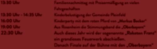 13:30 Uhr - 14:35 Uhr Kinderbelustigung der Gemeinde Pleinfeld 16:00 Uhr Kinderparty mit dem roten Pferd von „Markus Becker“ 19:00 Uhr Aus Rosenheim die Stimmungsband die „Oberbayern“ 22:30 Uhr Auch dieses Jahr wird der sogenannte „Raketen Franz“ ein grandioses Feuerwerk abschießen. Danach Finale auf der Bühne mit den „Oberbayern“