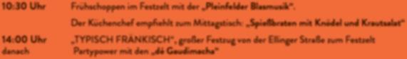 10:30 Uhr Frühschoppen im Festzelt mit der Pleinfelder Blasmusik“ Der Küchenchef empfiehlt zum Mittagstisch: „Spießbraten mit Knödel und Krautsalat“
