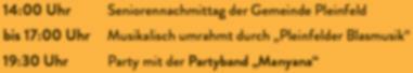 14:00 Uhr Seniorennachm ttag der Gemeinde Pleinfe d bis 17:00 Uhr Musikalisch umrahmt durch „P einfelder Blasmusik“ 19:30 Uhr Party mit der Partyband „Manyana