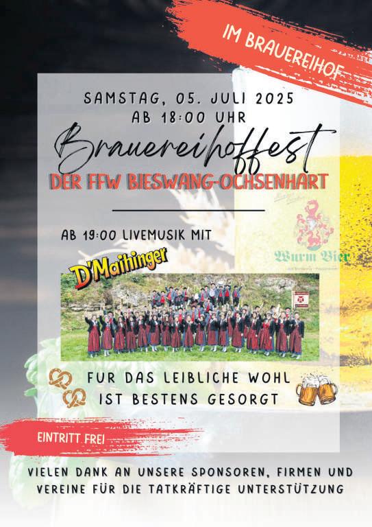Bieswang (ad). Die Freiwillige Feuerwehr Bieswang-Ochsenhart lädt am Samstag, 5. Juli 2025, ab 18.00 Uhr zum Brauereihoffest im Hof der Brauerei Wurm in Bieswang ein.
