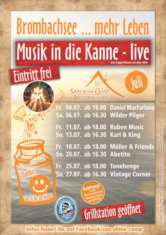 tigen Essensangeboten. Viel gemütlicher Platz, Beachvolleyballfelder und gute Sanitäranlagen runden den Veranstaltungsbereich ab Im direkten Umfeld befinden sich ein familiengeeigneter Hochseilgarten, ein Fahrradverleih und die Strandanlage mit Tretbootverleih am Igelsbachsee Ein Highlight ist sicherlich die MS Brombachsee Europas erster und größter Fahrgast-Trimaran. Er wird zwei Mal am Strand innerhalb des Festivalgeländes anlegen und für die Konzertbesucher eine exklusive Ehrenrunde drehen. Die Fahrkarten sind limitiert und an den zwei Eingängen bei den Kassen zu erwerben.
