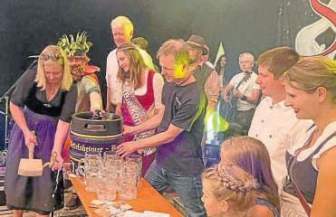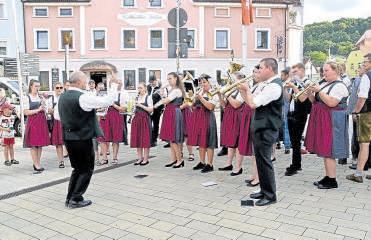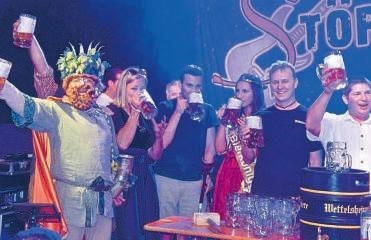 Treuchtlingen (do). In Treuchtlingen ist wieder Volksfestzeit. Am Freitag startete das zehntägige Fest traditionell mit dem Aufzug am Wallmüllerplatz, dem Standkonzert und dem Einzug ins Festzelt. Nach dem Anschießen des Volksfestes durch die Grabener Böllerschützen und vier kräftigen Schlägen war das beliebte Treuchtlinger Heimatfest dann offiziell eröffnet. Volksfest-Herz, was willst du mehr? Nach den Wetterkapriolen im letzten Jahr war es heuer wieder ein perfekter Festauftakt. Bei besten Bedingungen zogen die Treuchtlinger Stadtkapelle, die Tänzergruppen und der prächtige Festwagen mit dem Gambrinus zum Wallmüllerplatz. Dort herrschte bereits beste Stimmung. Dafür hatte traditionell die Feuerwehrkapelle Wettelsheim gesorgt. Auf dem Festwagen saß zum letzten Mal Thomas Stechhammer als Gambrinus der wieder mahnende Worte an das Volk richtete Ein farbenprächtiges Bild boten anschließend der Trachtenverein und die Siebenbürger Sachsen bei ihren schwungvollen Tanzvorführun-
