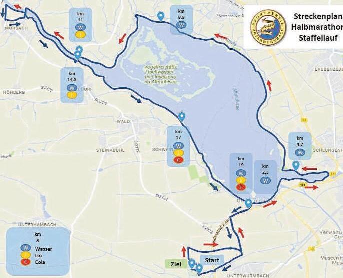 Der Startschuss für den Halbmarathon fällt um 18.00 Uhr Eine Teilnahme ist ab dem Geburtsjahr 2008 (oder älter) möglich. Zielschluss ist zum 20.30 Uhr Nach dem Start an der Sportanlage führt die Strecke auf direktem Weg zum Ringdamm um den Altmühlsee, vorbei an Schlungenhof und Muhr am See bis zur Streudorfer Brücke anschließend am Überleiter entlang zum Wendepunkt in Mörsach und von dort über das Seezentrum Wald zurück zur Sportanlage Die Laufstrecke ist amtlich vermessen, Kilometer-Markierungen sind angebracht. Wir weisen ausdrücklich darauf hin, dass auf der gesamten Strecke ausschließlich die markierten Wege zu benutzen sind.