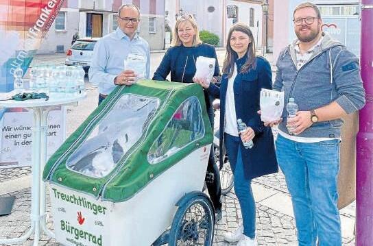 Landrat Manuel Westphal Treuchtlingens Bürgermeisterin Dr. Dr Kristina Becker, die Wirtschaftsförderin der Stadt Marina Stoll sowie der Klimaschutzmanager der Stadt Andreas Oswald (v. l. n. r.) dankten den fleißigen Radlern in Treuchtlingen. Foto: Landratsamt Weißenburg-Gunzenhausen / Verena Ortner