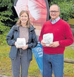 Die Koordinatorin des STADTRADELNs im Landkreis Verena Ortner und Landrat Manuel Westphal verteilten beim Pendlerfrühstück in Gunzenhausen Frühstückstüten Foto: Teresa Bieswanger