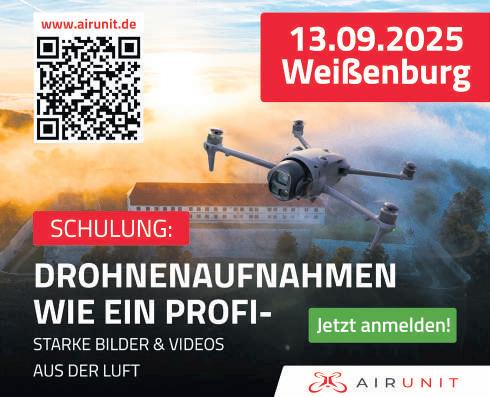 Bereits wen geTage zuvor am 13 September 2025, findet in Weißenburg e ne Schulung zur Drohnenfoto- und Videografie statt. In diesem rund sechsstündigen Intensiv-Workshop lernen die Teilnehmenden Schritt für Schritt, wie aus der Luft professionelle Fotos und Videos entstehen. Neben Fotografie Bildgestaltung und Videotechnik werden auch Flugtechnik, Sicherheit sowie rechtliche Grundlagen vermittelt.