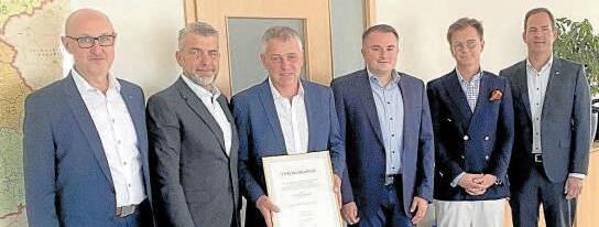 (v. l. n. r.:) Wilfried Wiedemann, Vorstandssprecher der VR Bank im südlichen Franken eG, Armin Kodlitz, Geschäftsbereichsleiter Agrar BayWa AG, Friedrich Siemandel, Geschäftsführer RWH Franken GmbH, Johannes Brünner, Bereichsleiter Gesamtbanksteuerung VR Bank Mittelfranken Mitte eG, Klaus Gimperlein Vorstandssprecher VR Bank Metropolregion Nürnberg eG, Martin Hoffmann, stellvertretender Vorstandsvorsitzender Raiffeisenbank Bad Windsheim eG Foto: Thomas Dörr