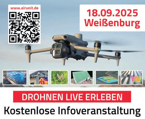 Am 18. September 2025, um 18.00 Uhr lädt das Weißenburger Unternehmen Airunit.de zu einer kostenfreien Infoveranstaltung ein. Besucher erleben dort Drohnen im Live-Einsatz und erfahren, wie vielseitig sie im Arbeitsalltag genutzt werden können. Anhand konkreter Praxisbeispiele zeigen die Experten unter anderem Anwendungen in der Dachvermessung bei Inspektionsflügen von Gebäuden und Industrieanlagen, in der Planung von Photovoltaikanlagen, bei der Flächenanalyse in der Landwirtschaft sowie in der Rehkitzrettung Der Infotag richtet sich besonders an Unternehmen, Handwerksbetriebe Planungsbüros Landwirte und weitere Branchen – sowie an Gründerinnen und Gründer die Drohnentechnik in ihre berufliche Zukunft integrieren möchten. Eine kostenfreie Anmeldung ist erforderlich unter: www.airunit.de