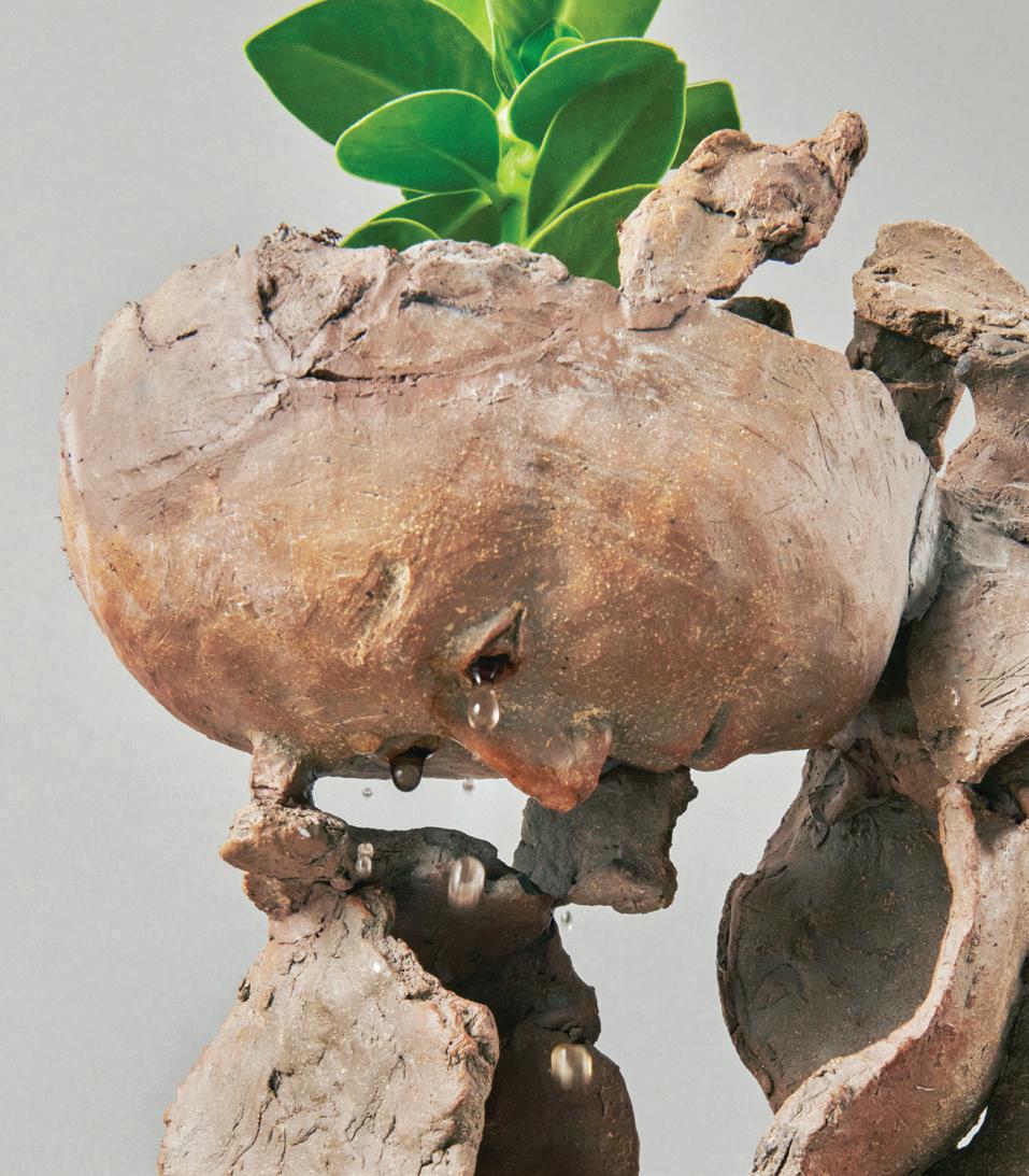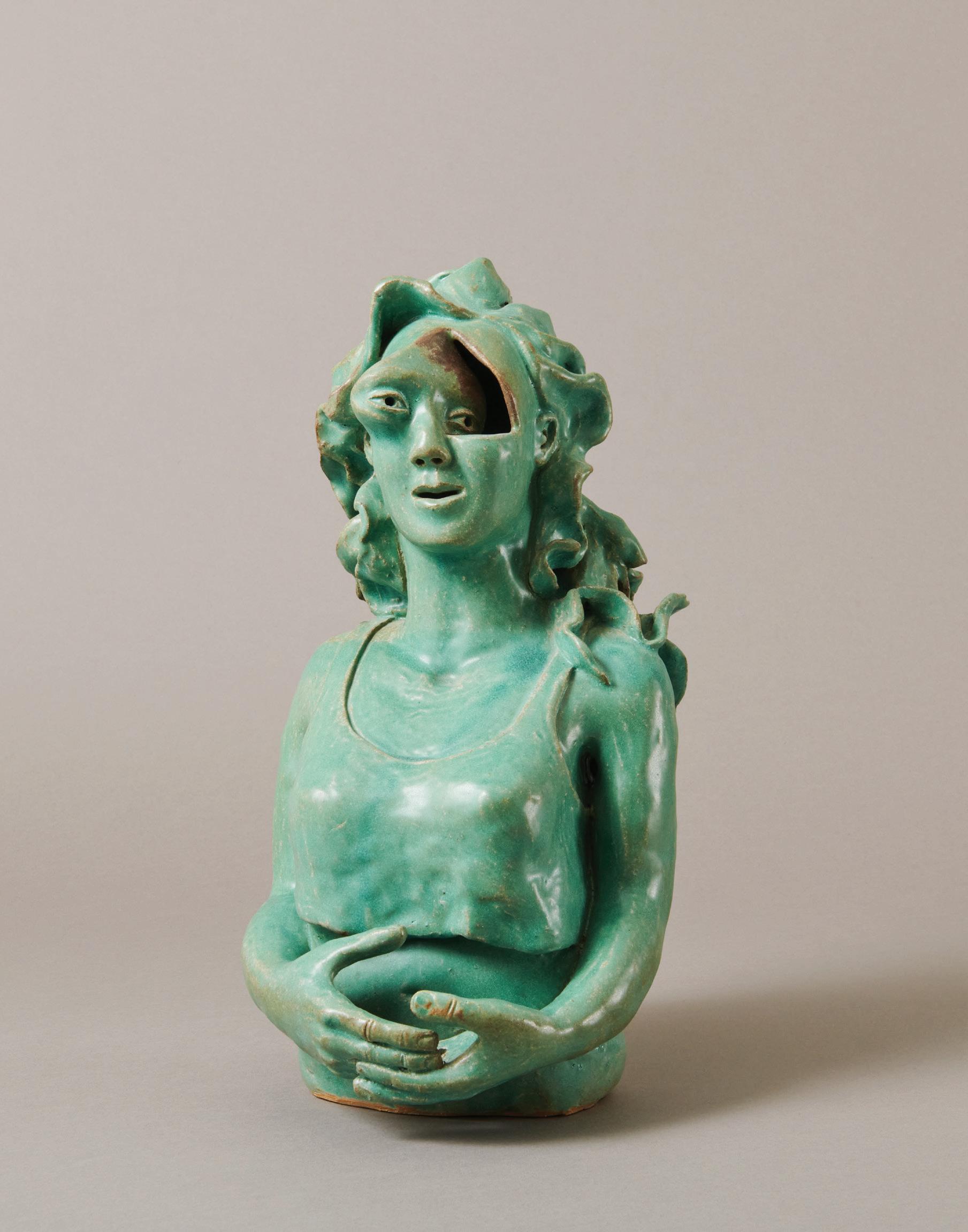 The notion that plants provide healing, for example, is expressed very directly in River (2020)-made with ceramic, glaze, beeswax and dirt--in which rippling blue and green waves wrap around the figure up to the neck, and the head is hollow, with a plant growing out of it. As Kristen writes: