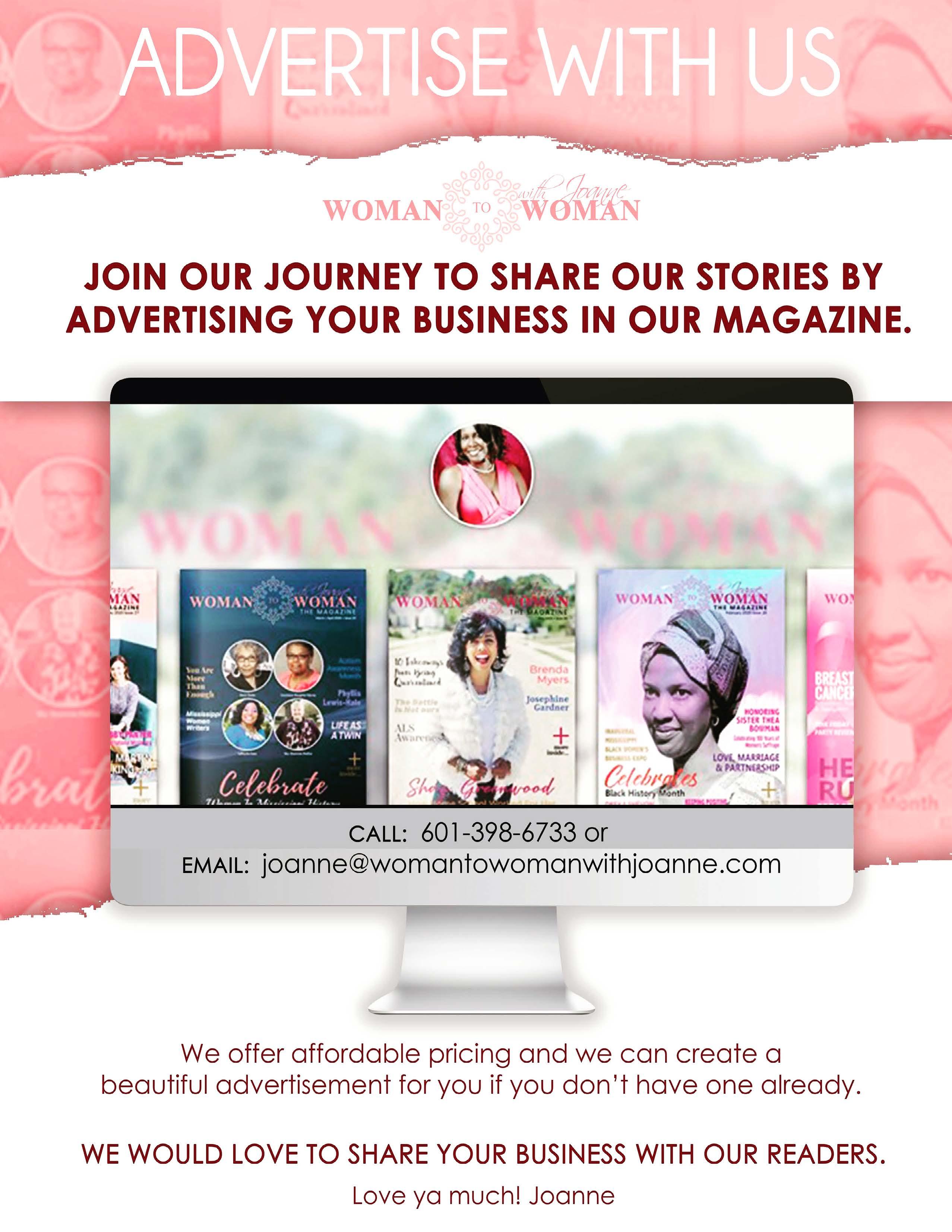 All rights reserved. No portion of Woman to Woman with Joanne may be reproduced without written permission from the publisher. The management of Woman to Woman with Joanne is not responsible for opinions expressed by its writers. Woman to Woman with Joanne maintains the unrestricted right to edit or refuse all submitted material. All advertisements are subject to approval by the publisher. The production of Woman to Woman is funded by advertising and sponsorship.