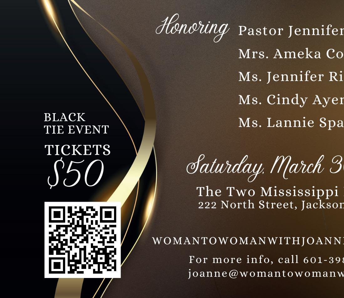 Publisher & Editor Joanne Bell Cover & Layout Design Ahmed Allaudin Staff Photographer Mya Bell Virtual Assistant Christine Davis Contributing Writers Salmeilia Stewart, KeNosha Whitehead, Anika Stewart Website womantowomanwithjoanne.com Subscribe bit.ly/joannebellmag All rights reserved. No portion of Woman to Woman with Joanne may be reproduced without written permission from the publisher. The management of Woman to Woman with Joanne is not responsible for opinions expressed by its writers. Woman to Woman with Joanne maintains the unrestricted right to edit or refuse all submitted material. All advertisements are subject to approval by the publisher. The production of Woman to Woman is funded by advertising and sponsorship. In This Issue COTACT WITH US 601-398-6733 woman2woman.joanne@yahoo.com 8 Love Thyself Salmeilia Stewart 10 No Distractions! No Limits! No Excuses! Anika Stewart 12 Rough Week – God Wrote You A Love Letter KeNosha Whitehead 15 Pastor Jennifer Biard - Story 16 Ameka Coleman - Story 19 Jennifer Riley Collins - Story 20 Dr. Cindy Ayers Elliott - Story 22 Mrs. Lannie Spann McBride - Story 24 2017 Mississippi Legends Ball Honorees 25 2018 Mississippi Legends Ball Honorees 26 2019 Mississippi Legends Ball Honorees 27 2022 Mississippi Legends Ball Honorees 28 2023 Mississippi Legends Ball Honorees