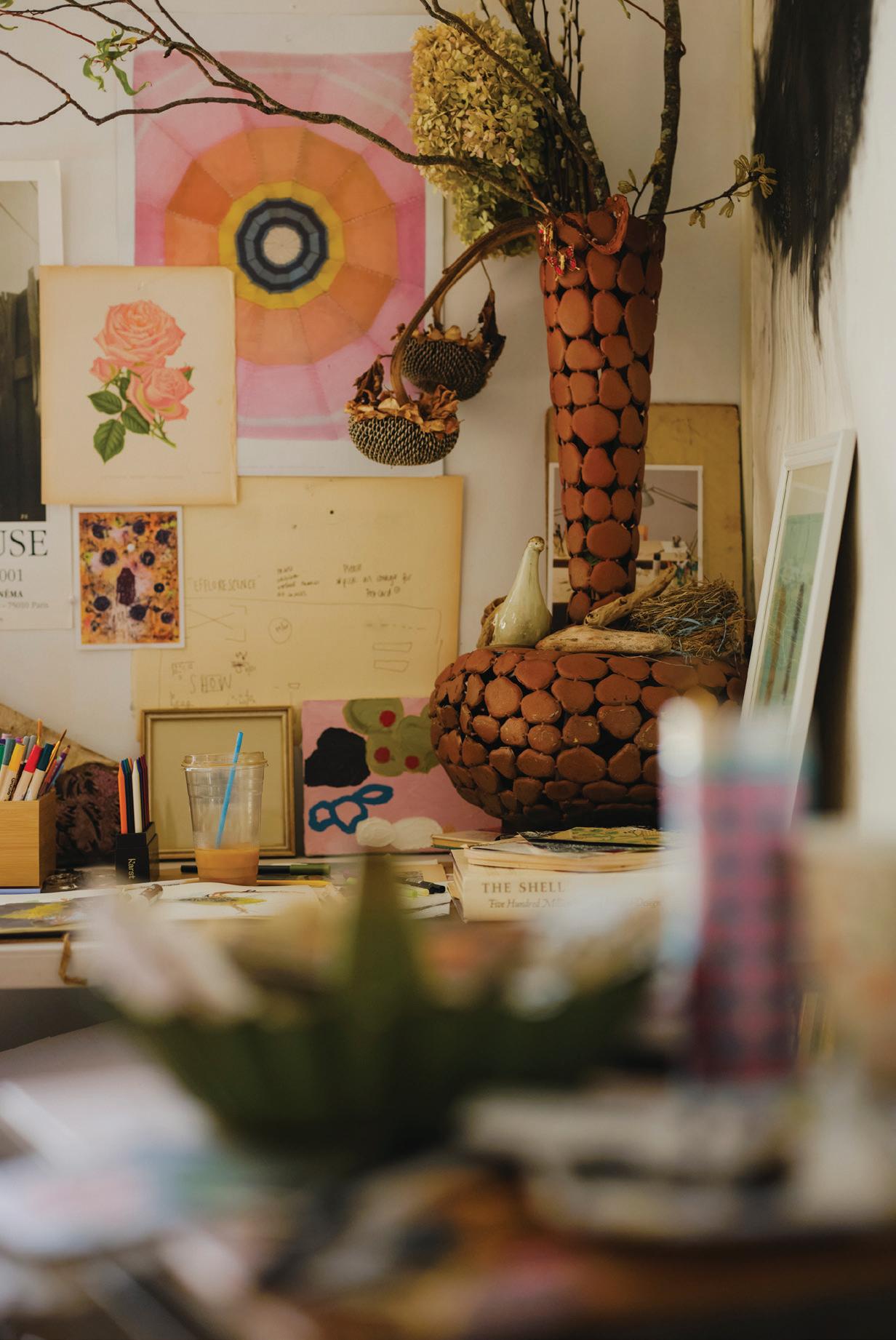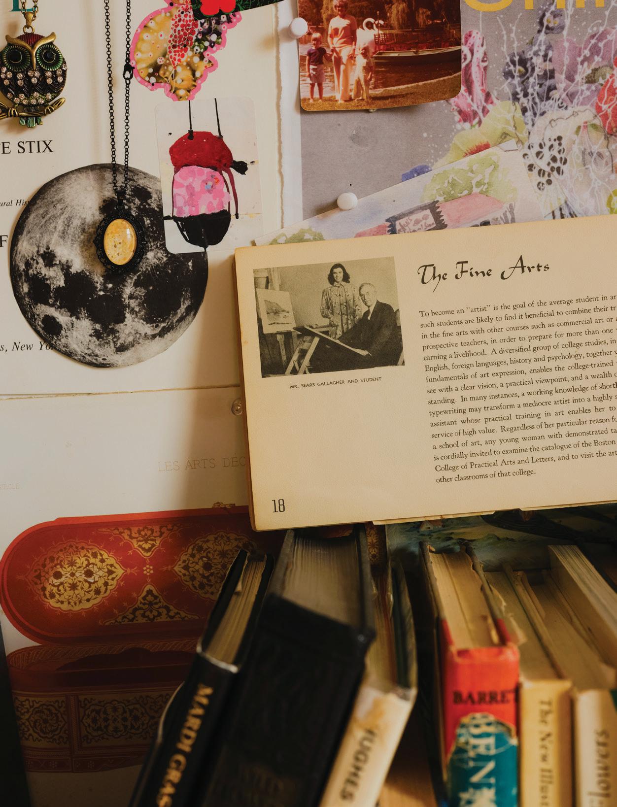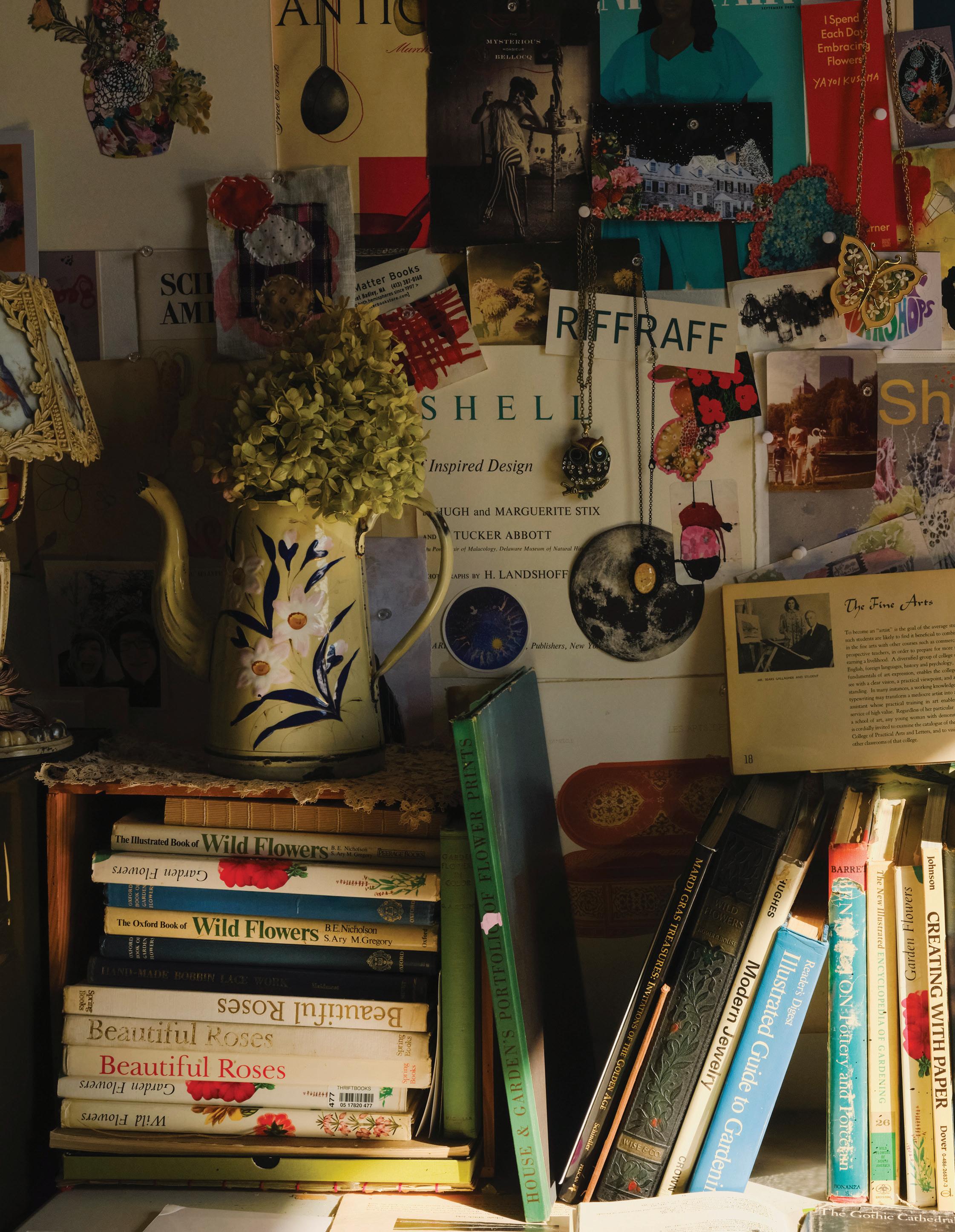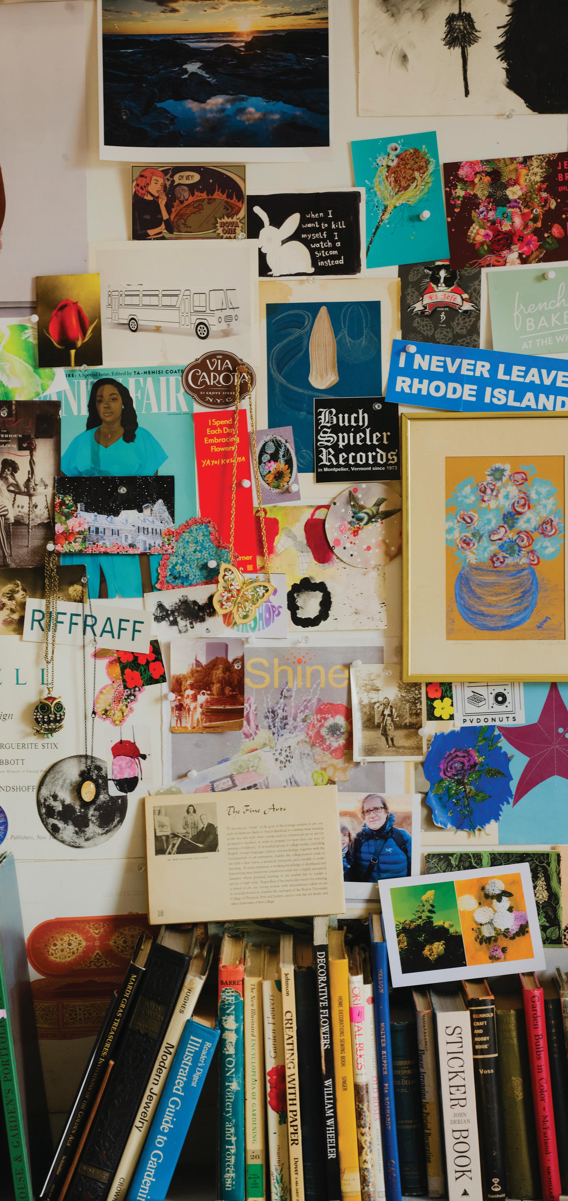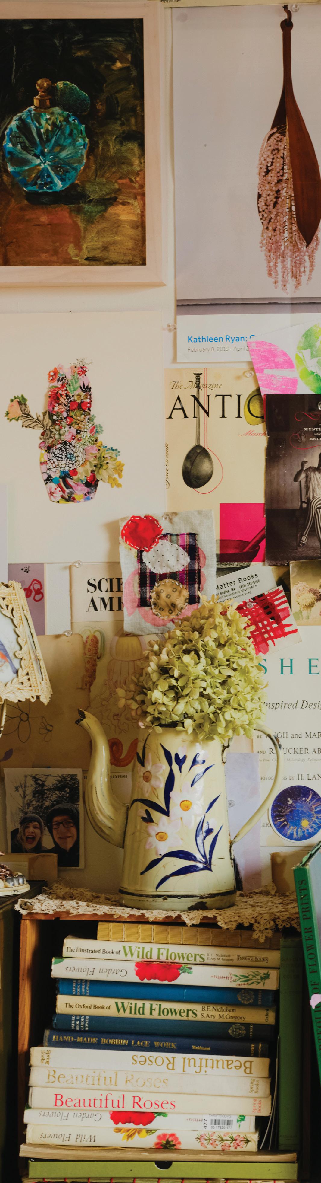feel like my ever-growing, dense, and allencompassing wall displays give me the opportunity to reflect on where I started as an artist, where I am now with my work, and how I plan to evolve with my practice going forward. I know I can make my work anywhere, even on my kitchen table if that’s the only space I have available to me. I also know that having the space where I can be surrounded by my memories is one of the most inspiring ways to work, because it is a beautiful reminder of what brought me to this exact place in time. Most importantly, I know if the studio had to close up shop tomorrow, all of this creative energy comes with me, forever and always, in my heart and in my mind. In the sketchbooks balanced on my lap as I draw, and it lives on in the dusty boxes of collected treasures in attics far and wide that I’ll likely never make it back to.