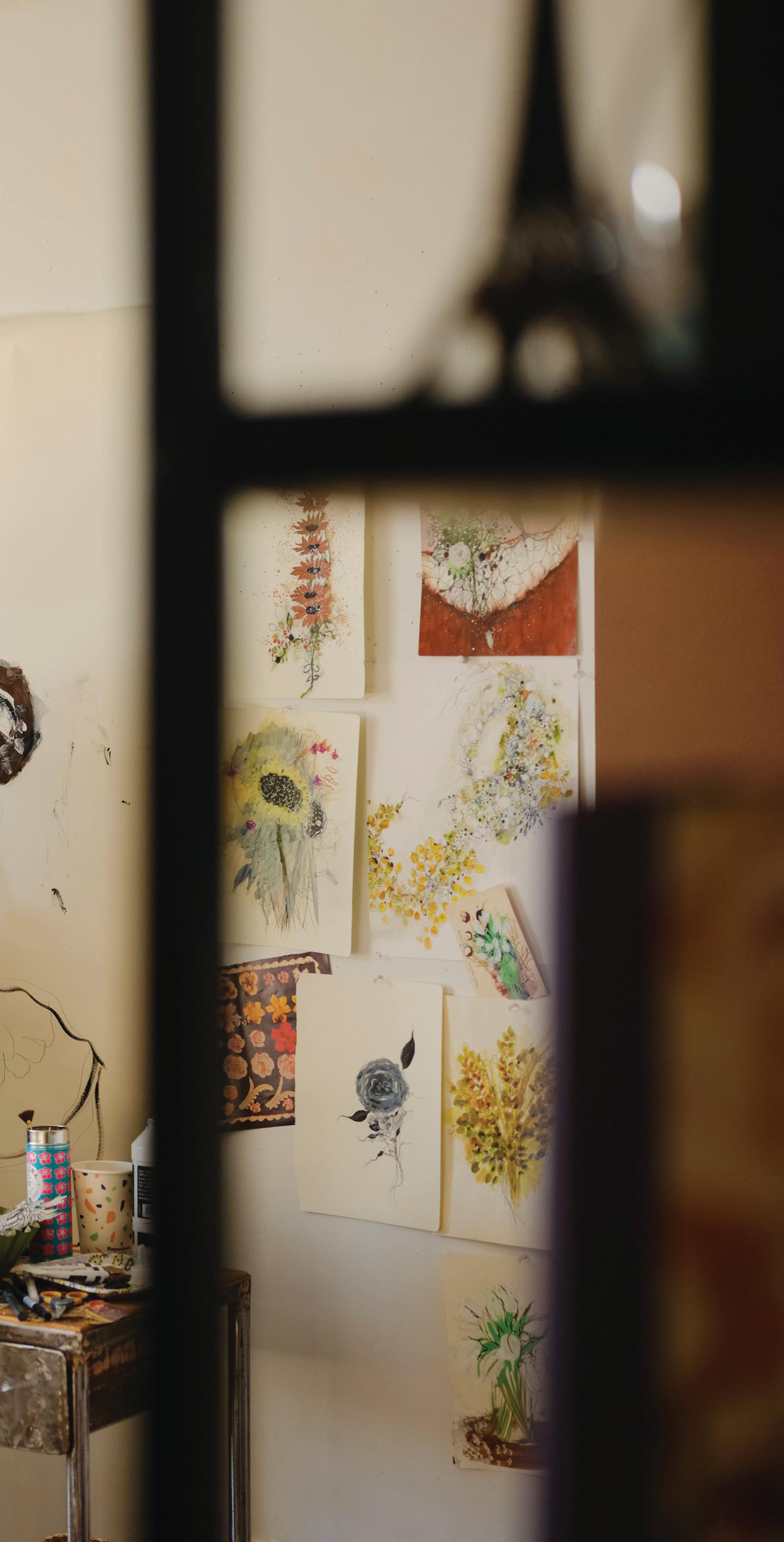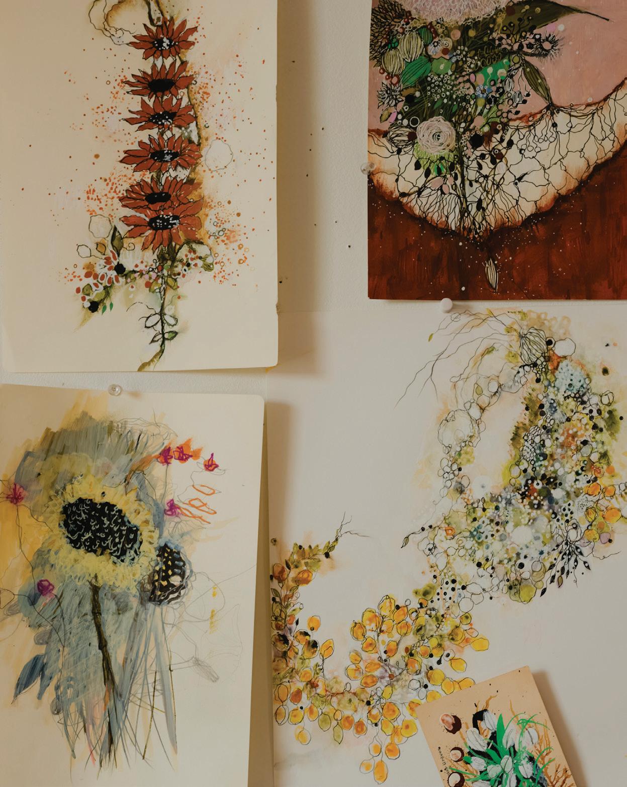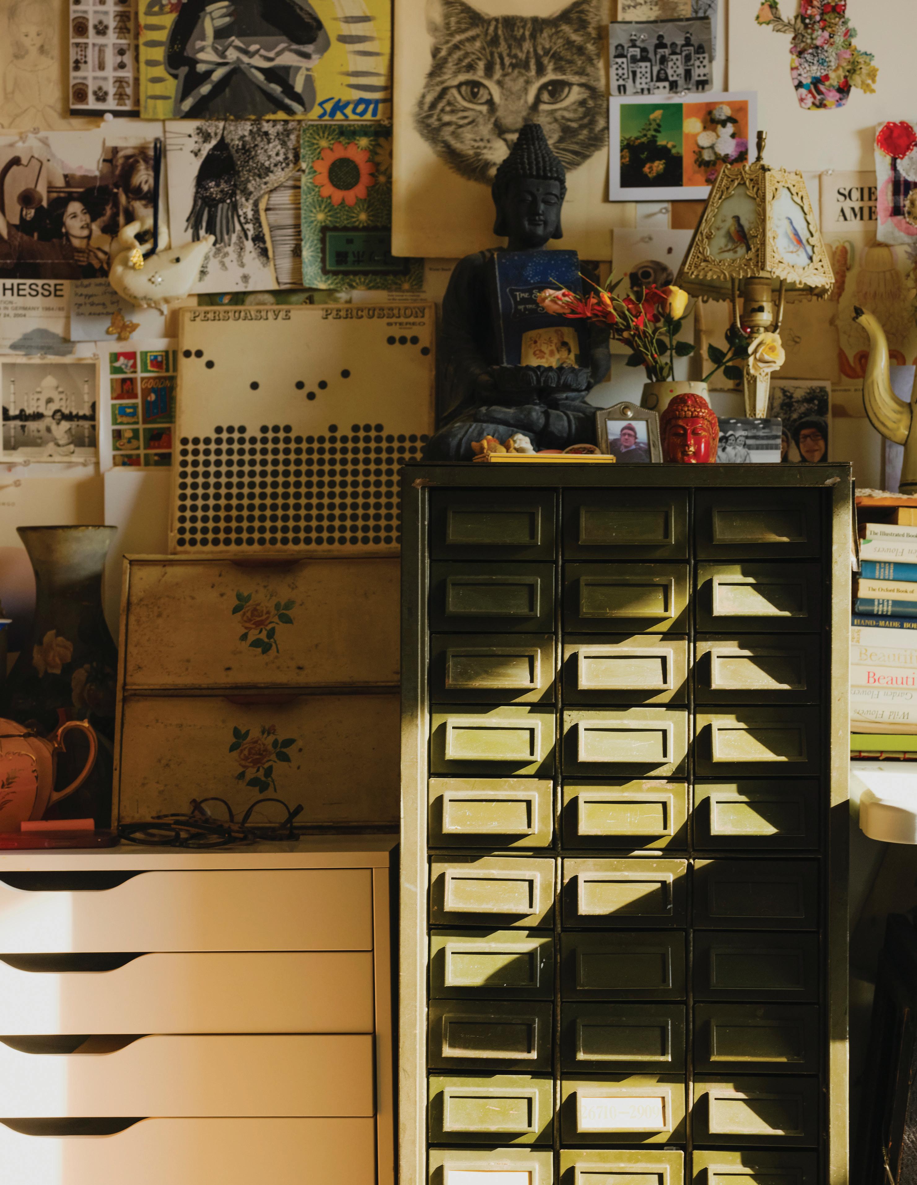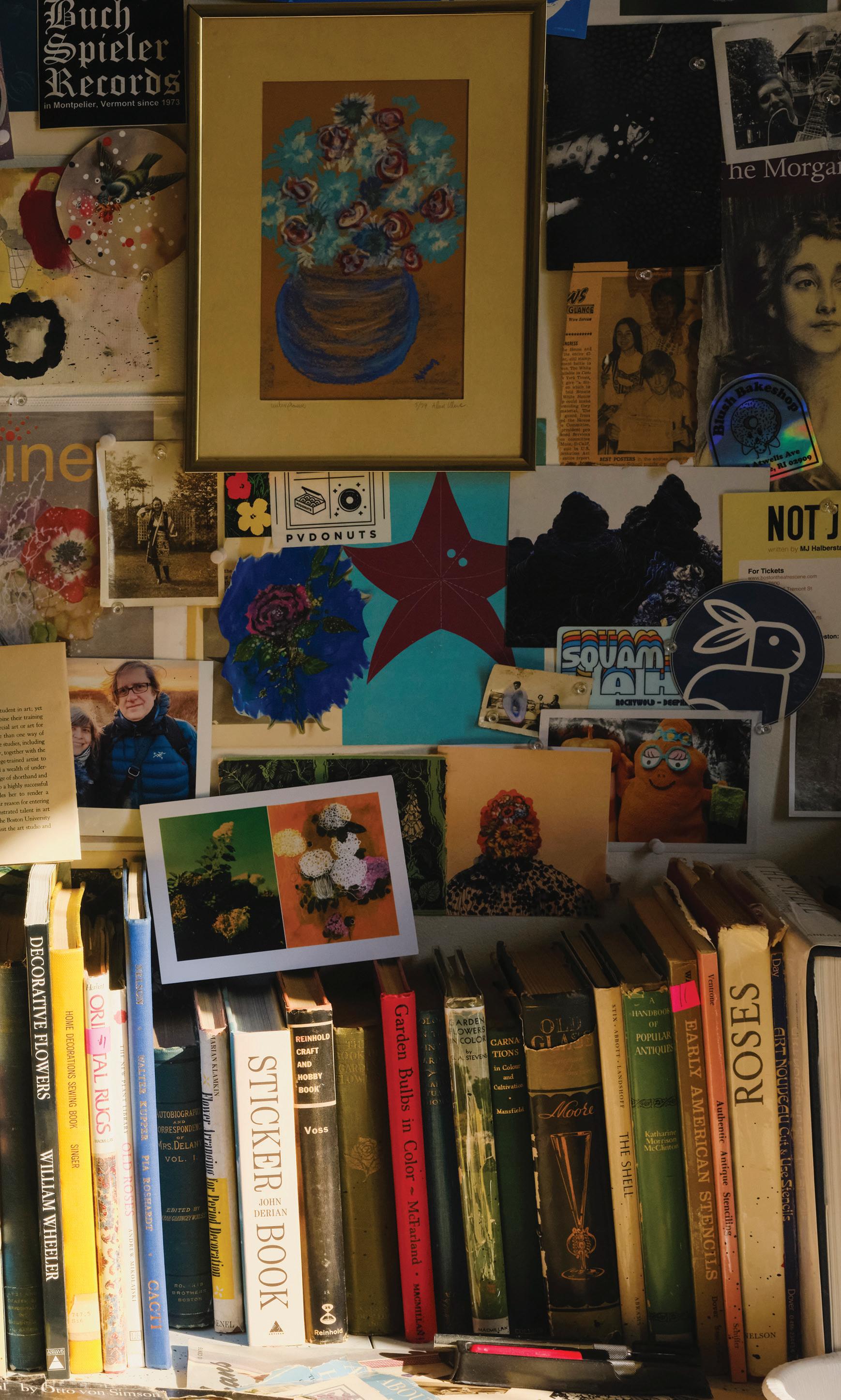 feel like my ever-growing, dense, and allencompassing wall displays give me the opportunity to reflect on where I started as an artist, where I am now with my work, and how I plan to evolve with my practice going forward. I know I can make my work anywhere, even on my kitchen table if that’s the only space I have available to me. I also know that having the space where I can be surrounded by my memories is one of the most inspiring ways to work, because it is a beautiful reminder of what brought me to this exact place in time. Most importantly, I know if the studio had to close up shop tomorrow, all of this creative energy comes with me, forever and always, in my heart and in my mind. In the sketchbooks balanced on my lap as I draw, and it lives on in the dusty boxes of collected treasures in attics far and wide that I’ll likely never make it back to.