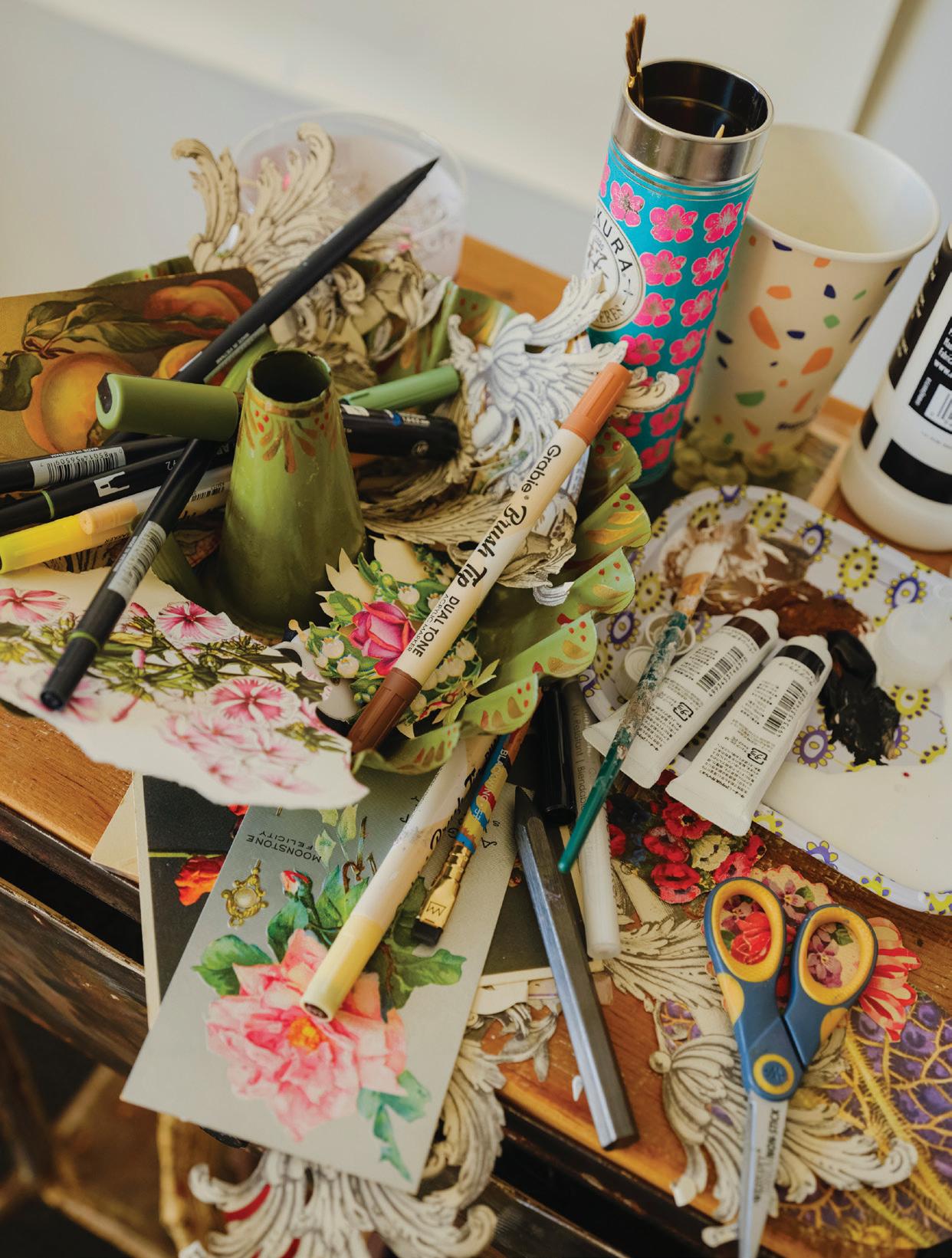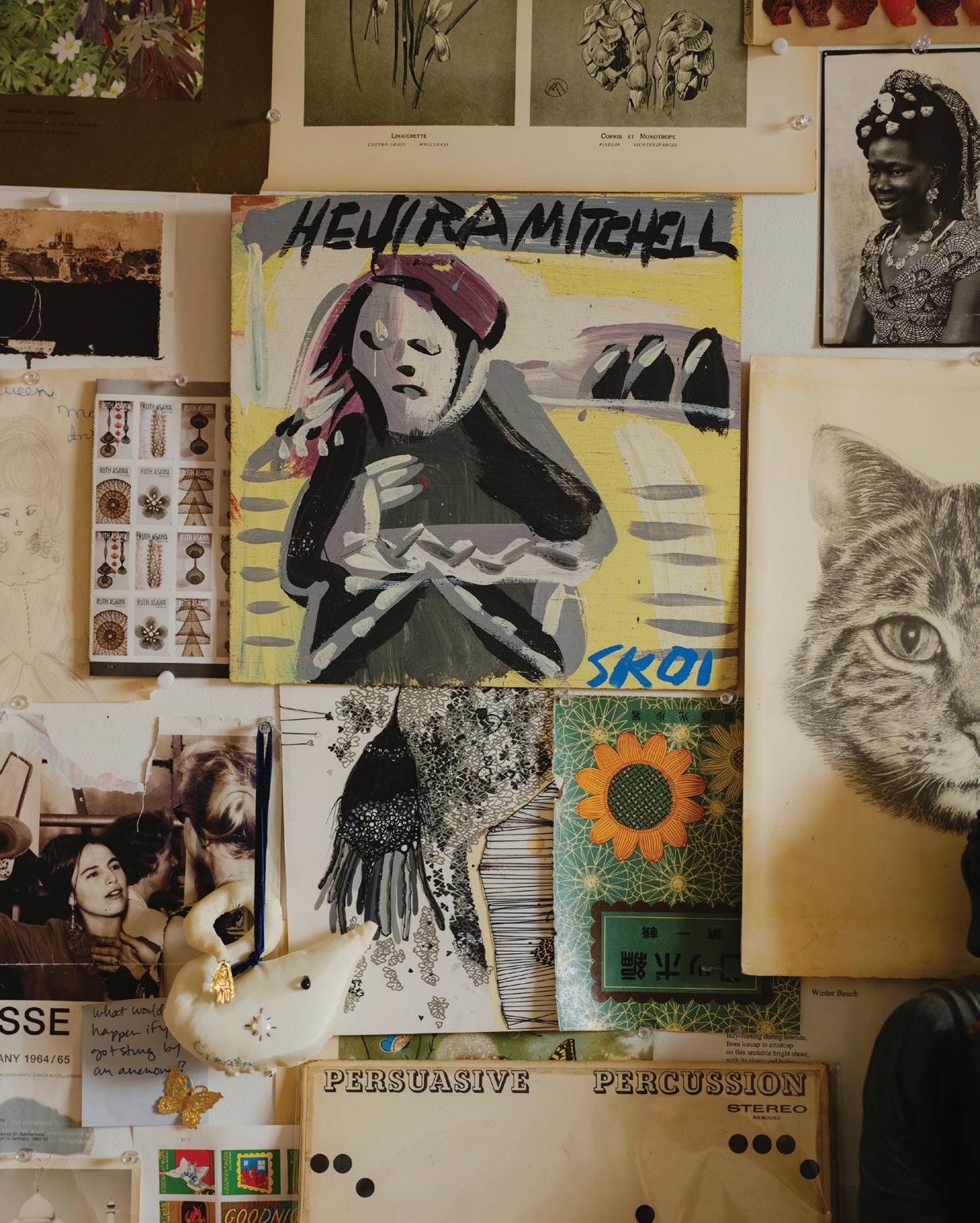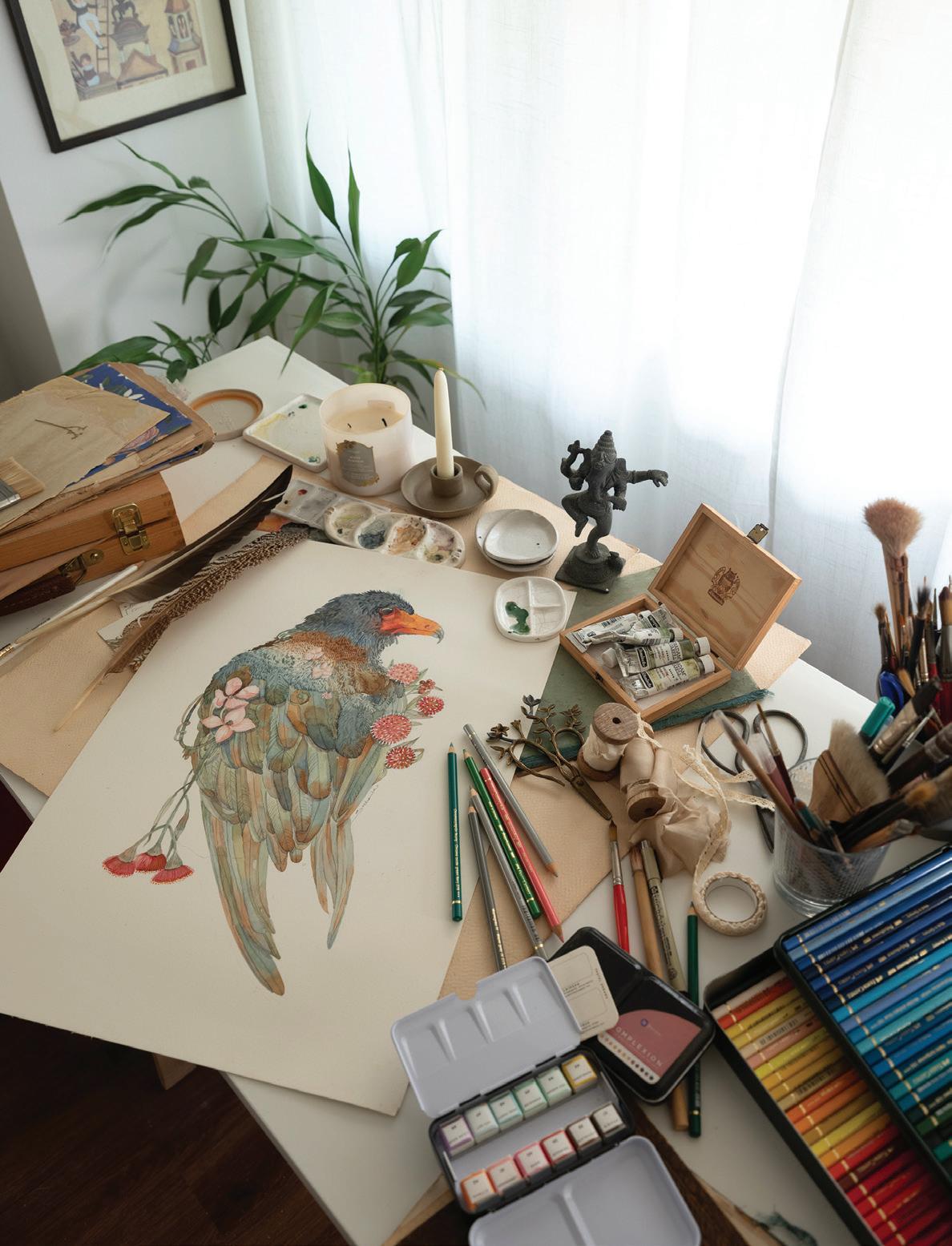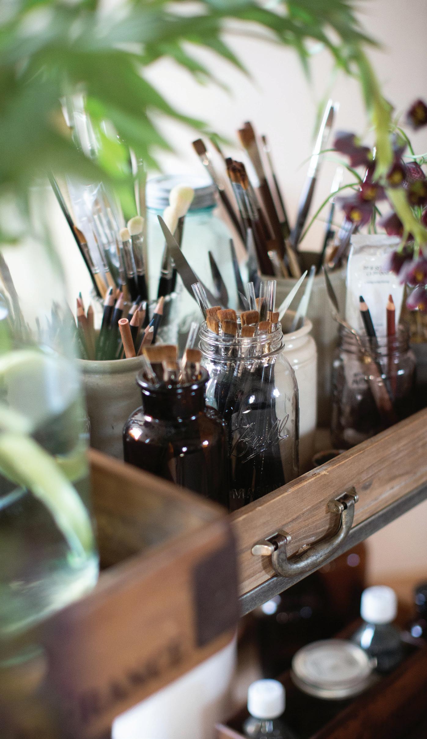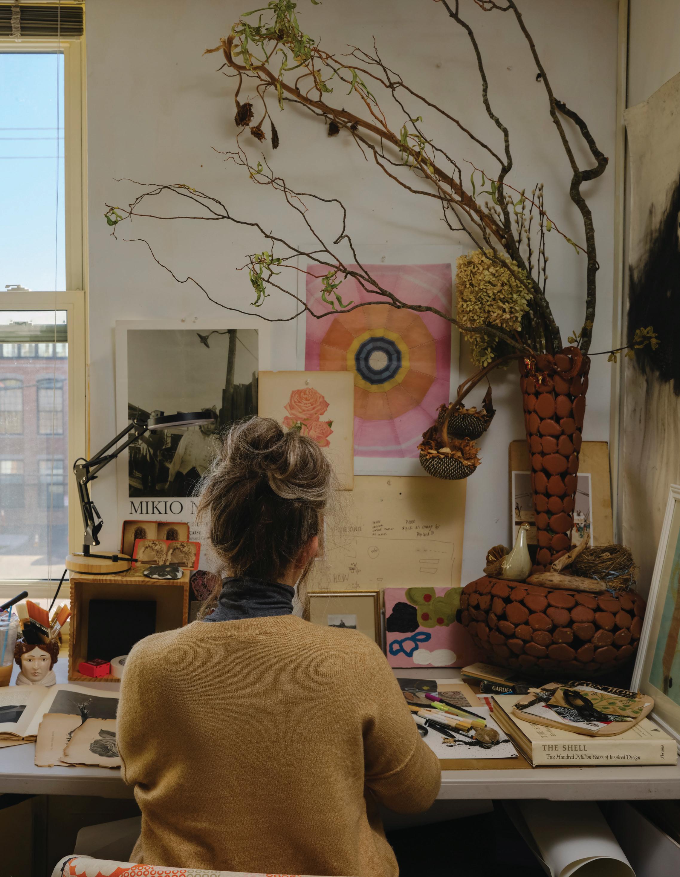 feel like my ever-growing, dense, and allencompassing wall displays give me the opportunity to reflect on where I started as an artist, where I am now with my work, and how I plan to evolve with my practice going forward. I know I can make my work anywhere, even on my kitchen table if that’s the only space I have available to me. I also know that having the space where I can be surrounded by my memories is one of the most inspiring ways to work, because it is a beautiful reminder of what brought me to this exact place in time. Most importantly, I know if the studio had to close up shop tomorrow, all of this creative energy comes with me, forever and always, in my heart and in my mind. In the sketchbooks balanced on my lap as I draw, and it lives on in the dusty boxes of collected treasures in attics far and wide that I’ll likely never make it back to.