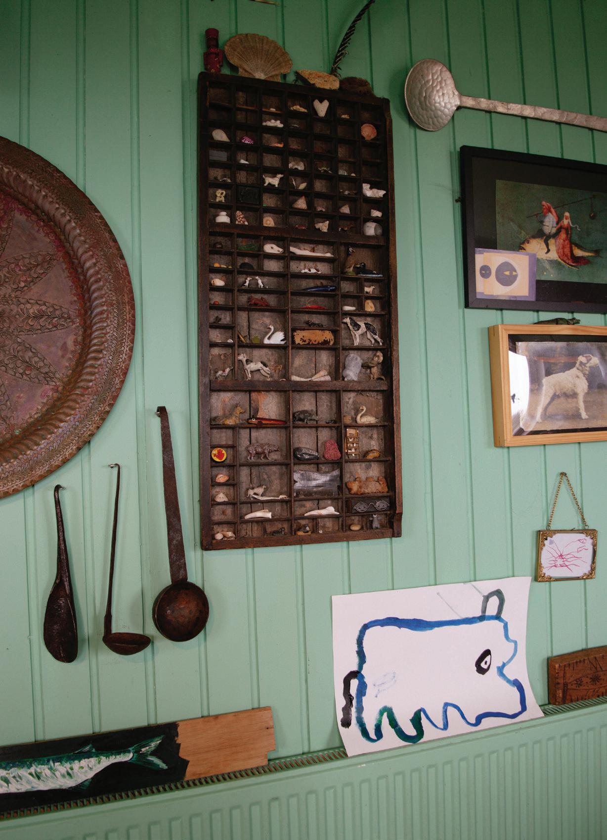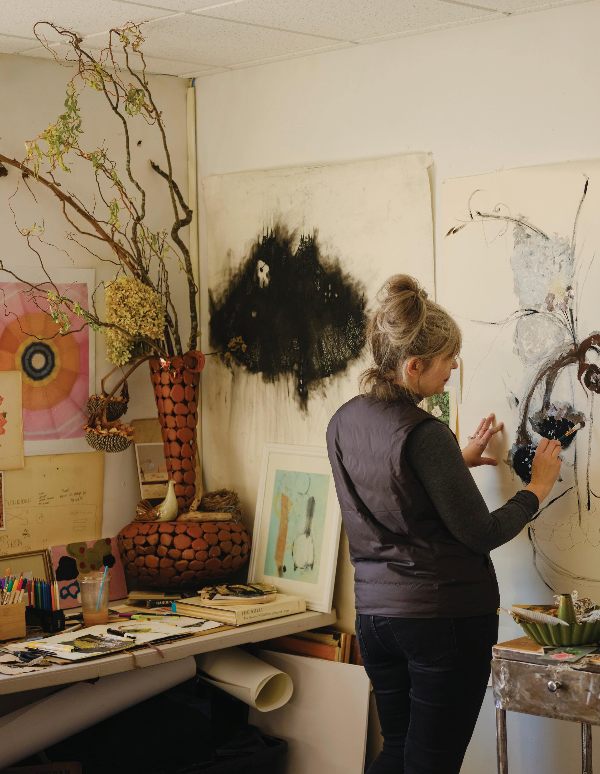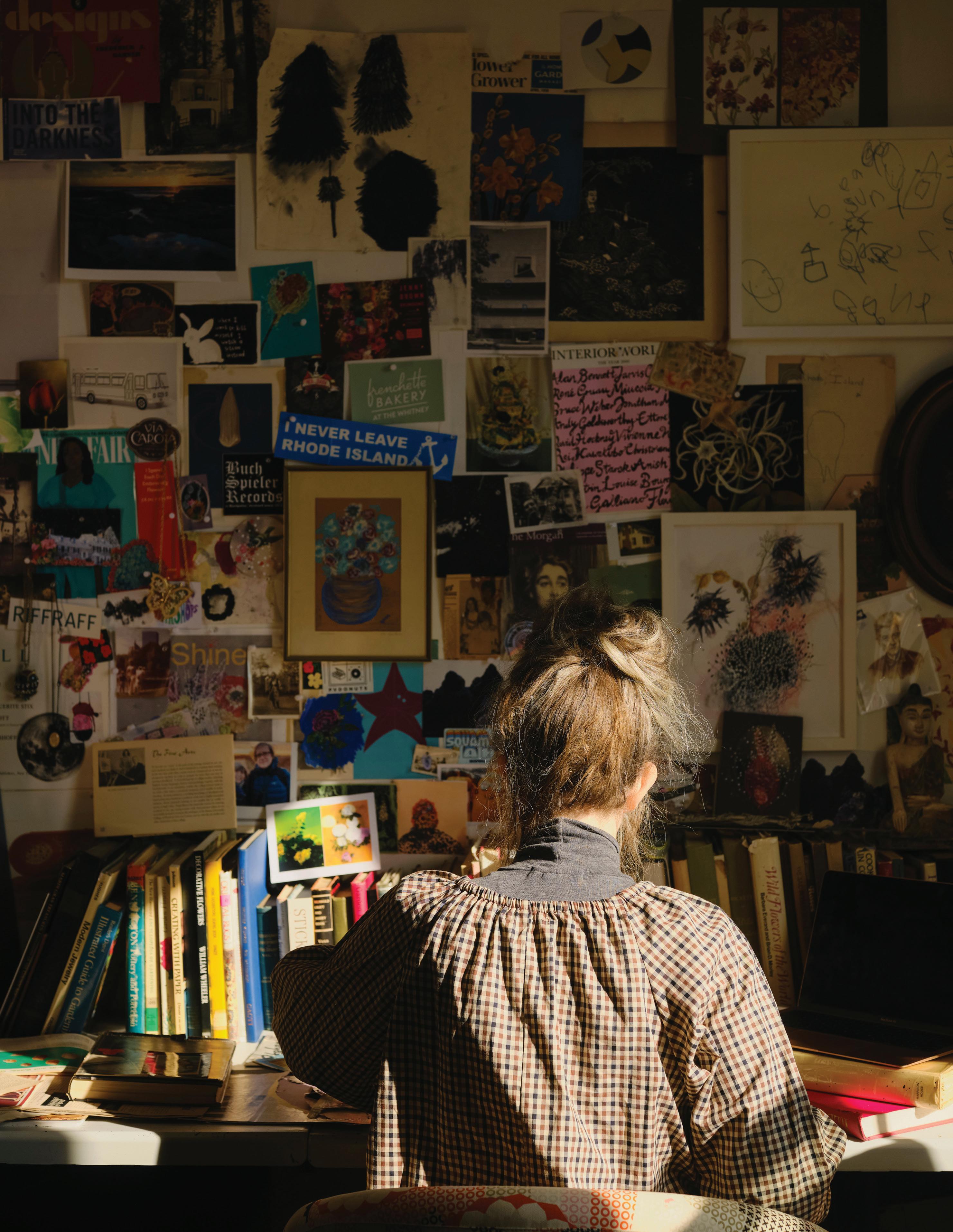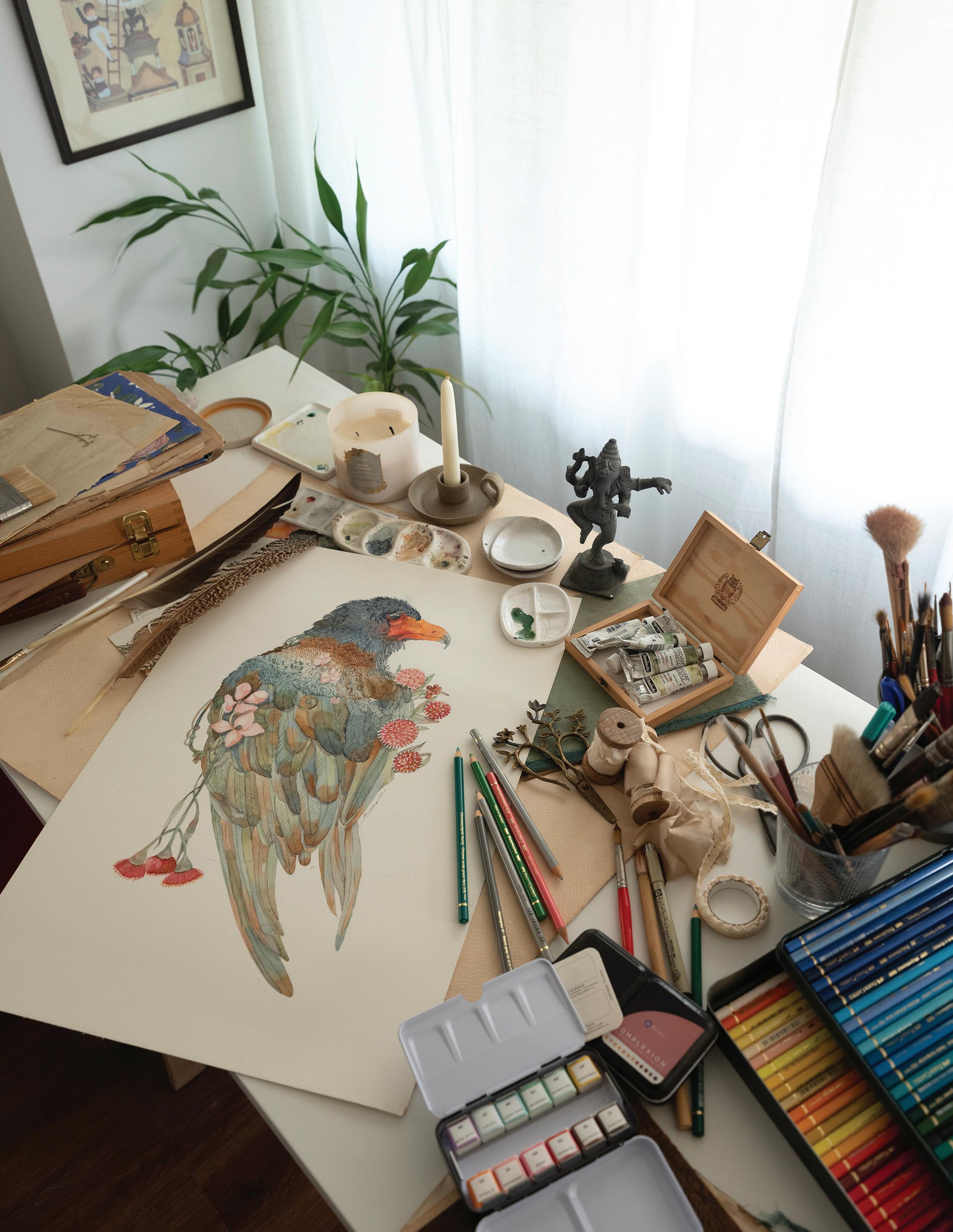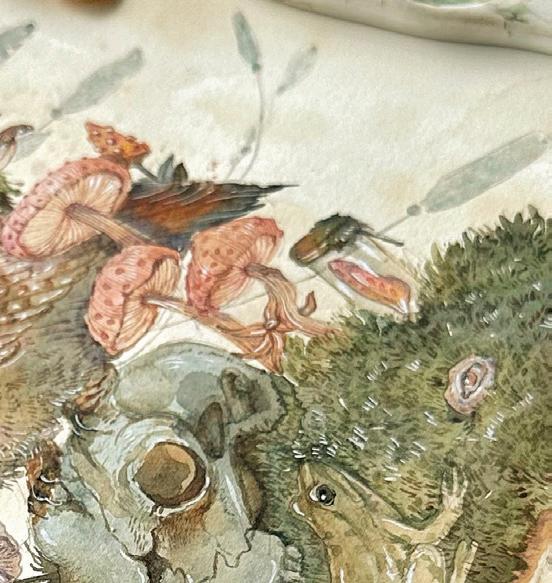 feel like my ever-growing, dense, and allencompassing wall displays give me the opportunity to reflect on where I started as an artist, where I am now with my work, and how I plan to evolve with my practice going forward. I know I can make my work anywhere, even on my kitchen table if that’s the only space I have available to me. I also know that having the space where I can be surrounded by my memories is one of the most inspiring ways to work, because it is a beautiful reminder of what brought me to this exact place in time. Most importantly, I know if the studio had to close up shop tomorrow, all of this creative energy comes with me, forever and always, in my heart and in my mind. In the sketchbooks balanced on my lap as I draw, and it lives on in the dusty boxes of collected treasures in attics far and wide that I’ll likely never make it back to.