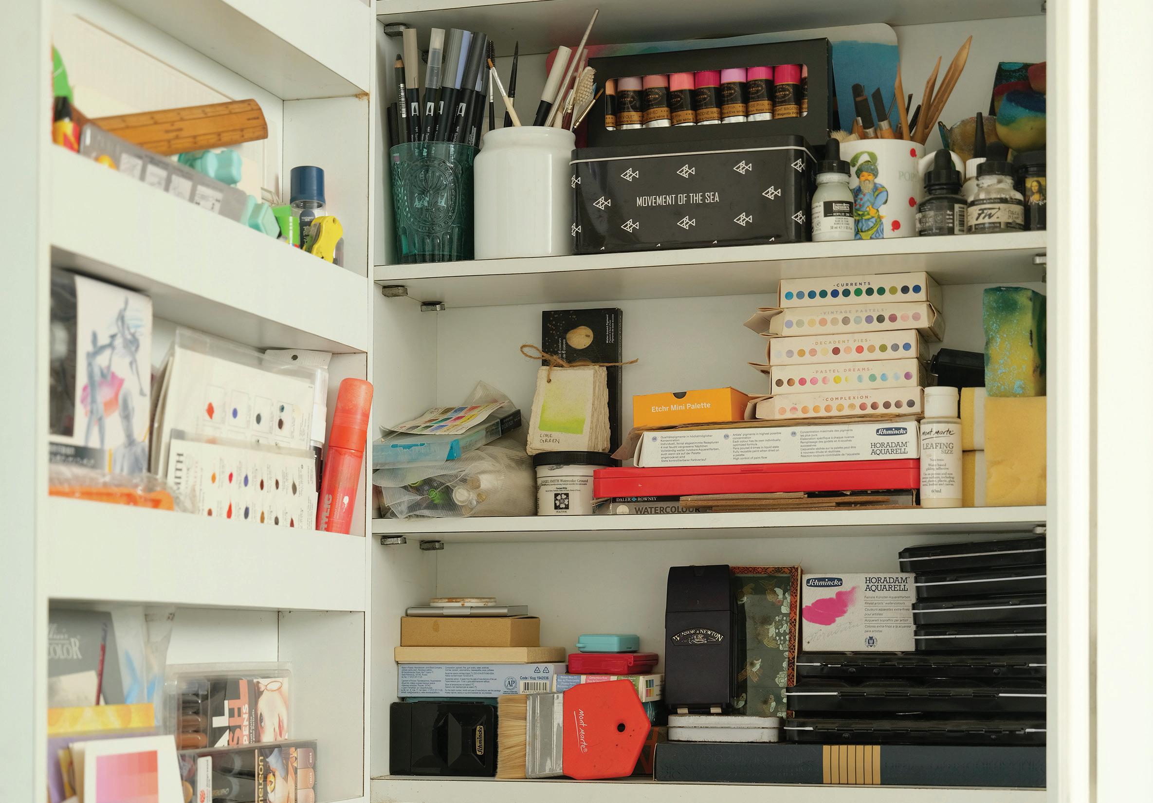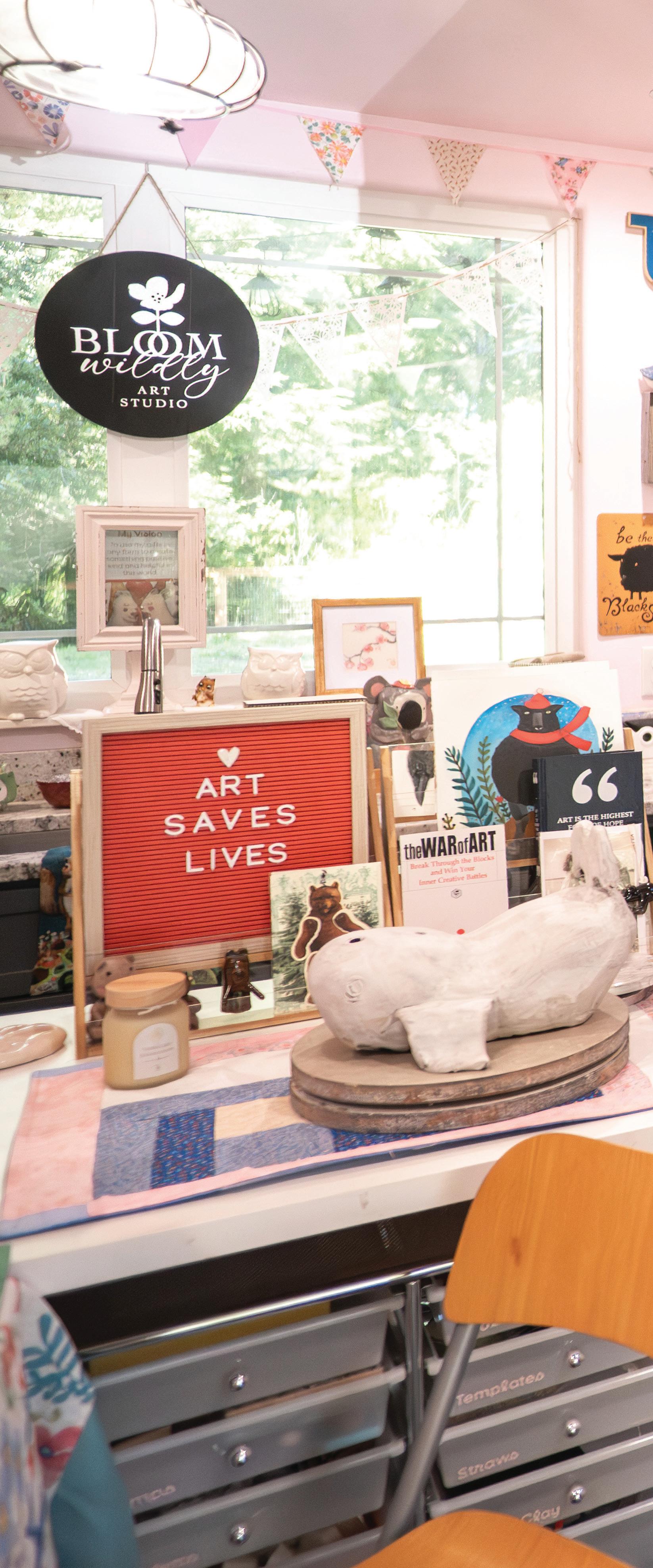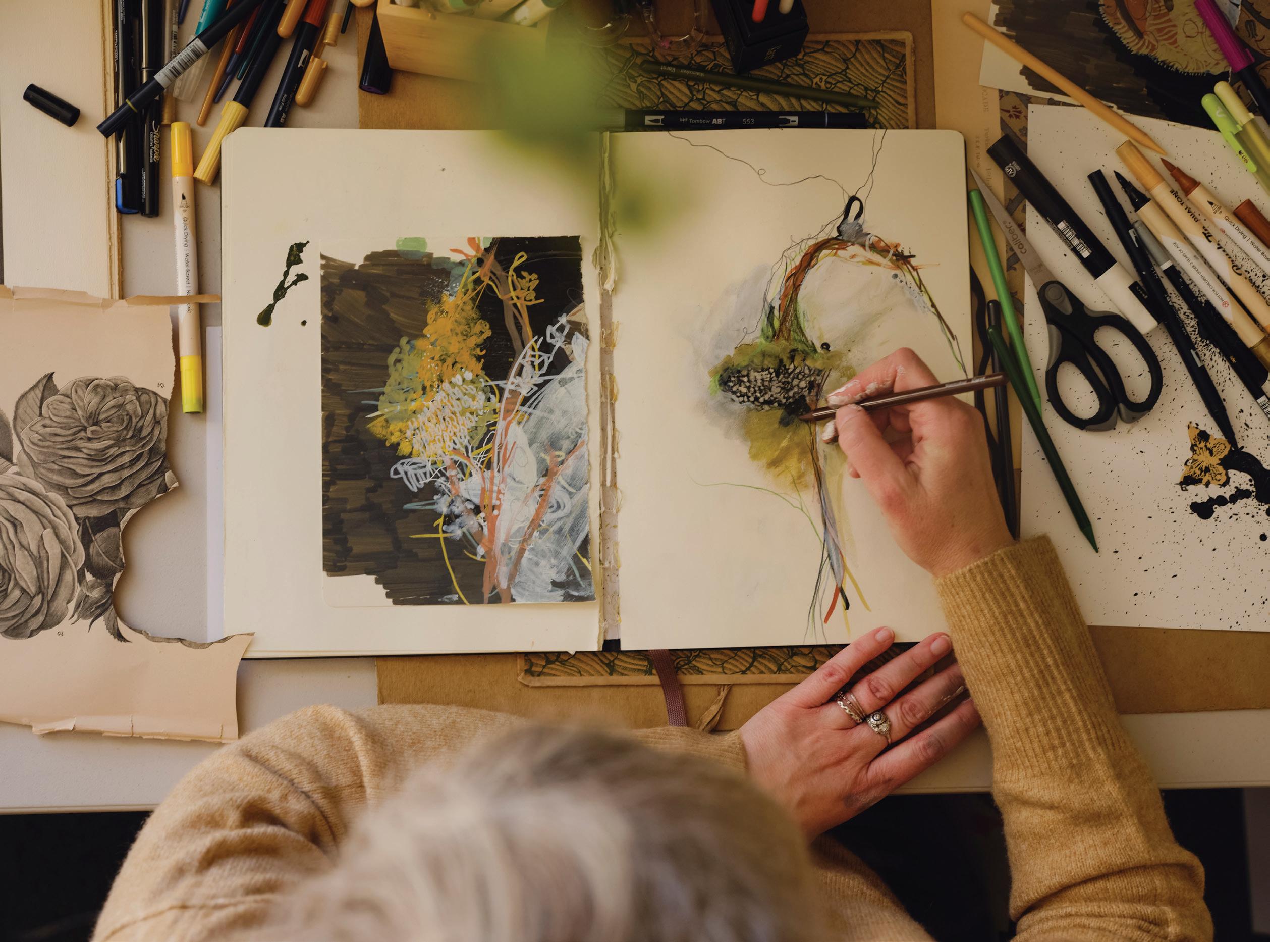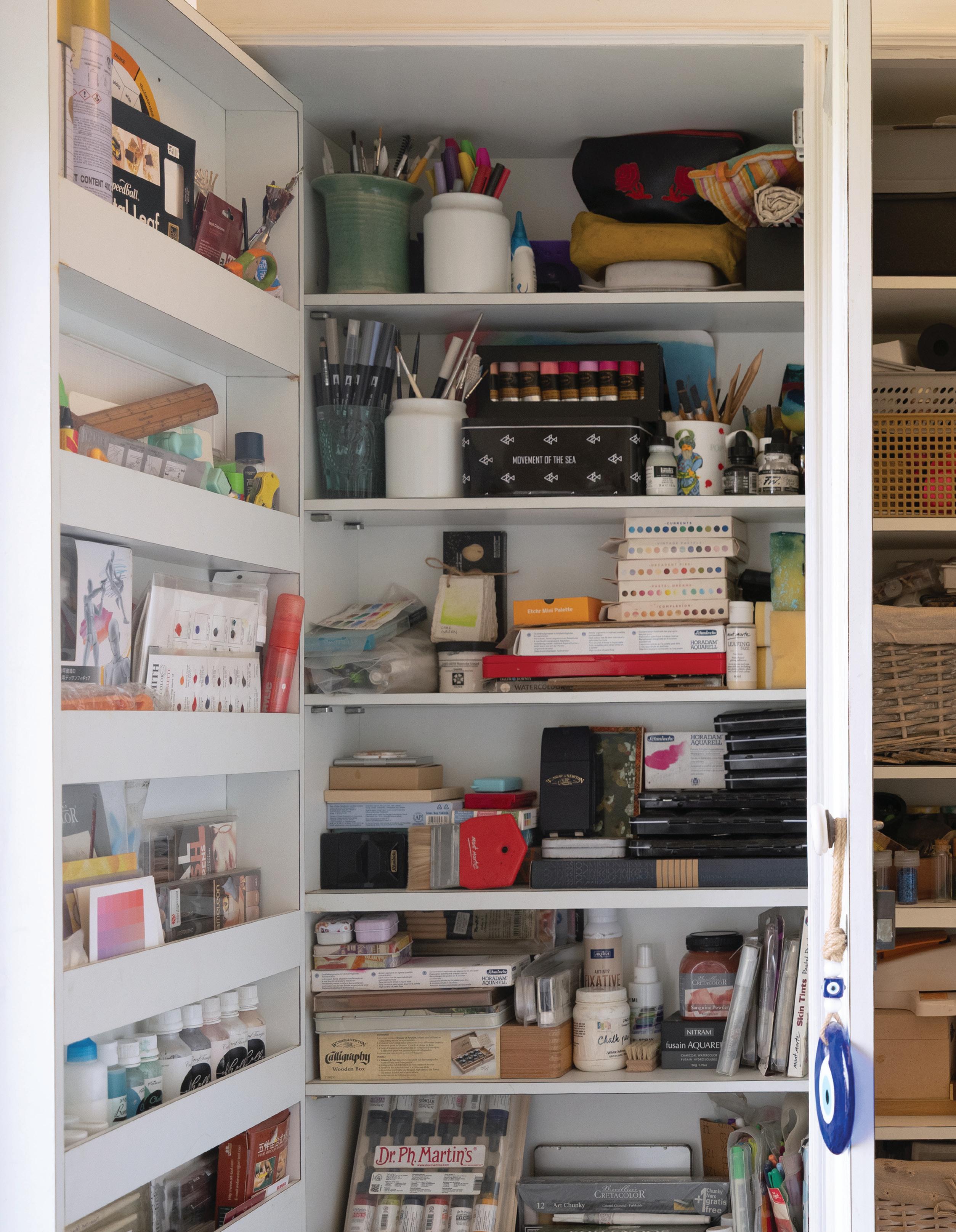 feel like my ever-growing, dense, and allencompassing wall displays give me the opportunity to reflect on where I started as an artist, where I am now with my work, and how I plan to evolve with my practice going forward. I know I can make my work anywhere, even on my kitchen table if that’s the only space I have available to me. I also know that having the space where I can be surrounded by my memories is one of the most inspiring ways to work, because it is a beautiful reminder of what brought me to this exact place in time. Most importantly, I know if the studio had to close up shop tomorrow, all of this creative energy comes with me, forever and always, in my heart and in my mind. In the sketchbooks balanced on my lap as I draw, and it lives on in the dusty boxes of collected treasures in attics far and wide that I’ll likely never make it back to.