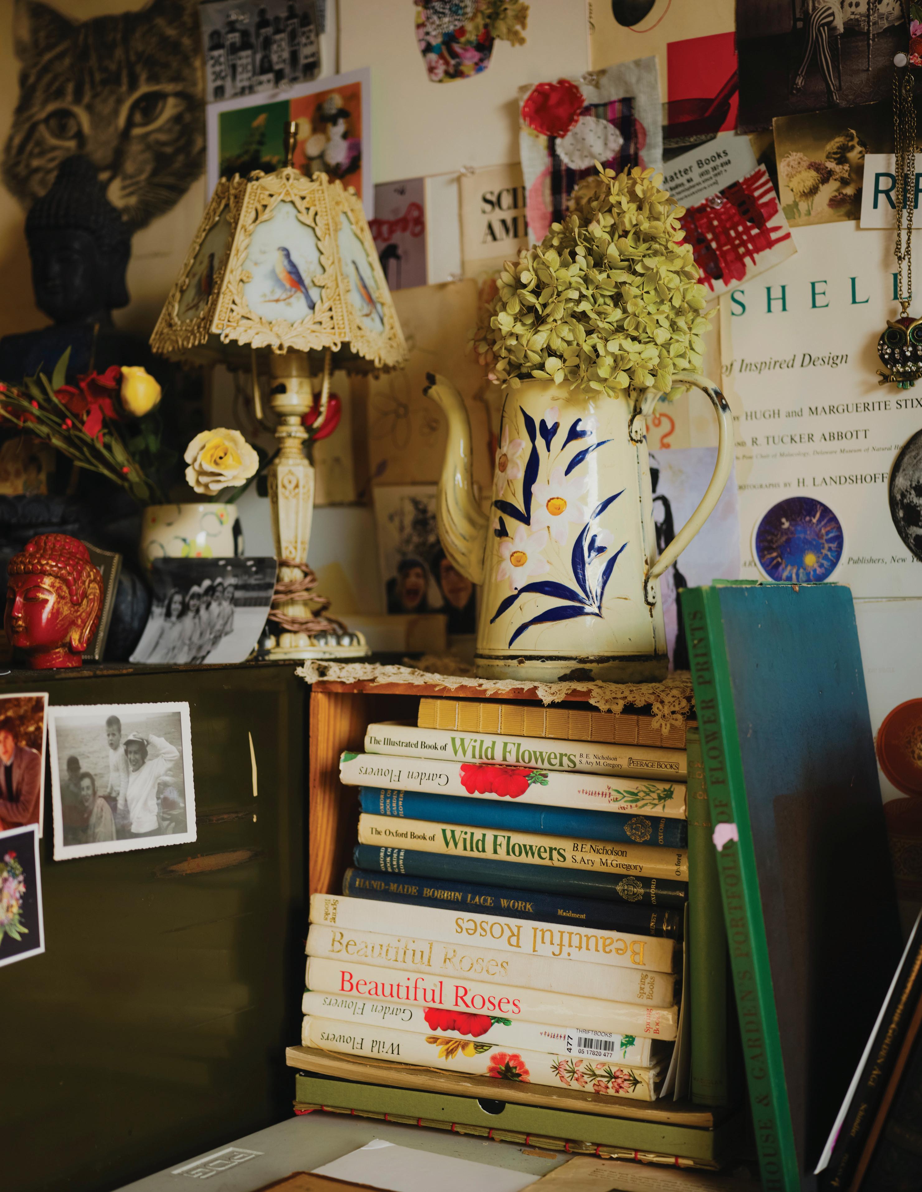 age 20. A place where I can build a giant still life with dried blossoms and the branch of a willow tree. Mine to display vintage teapots and antique flower paintings in chipped gold and silver painted frames. A place to leave my tables covered in clippings taken from old botanical encyclopedias and quilt pattern books. A space to make messy drawings of swirling seaweed that I hate and hide in between stacks of books until I’m ready to work on them again. A place to make big collages that I don’t tell anyone about if I don’t want to. A place where I can become mesmerized by a top-heavy mullein plant growing in the cracks of the sidewalk outside my window, so much so that I make them a regular part of the visual vocabulary in my work.