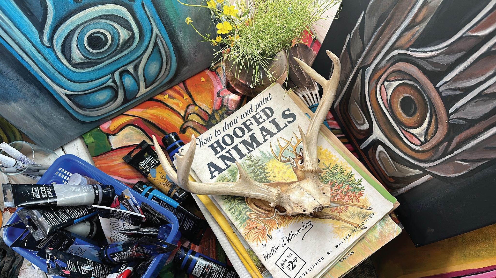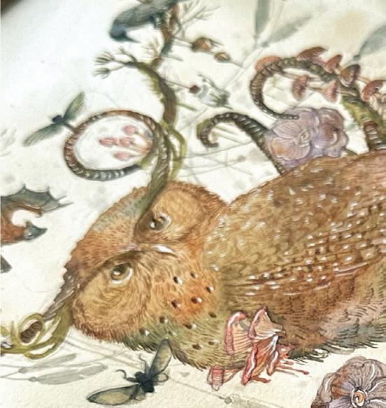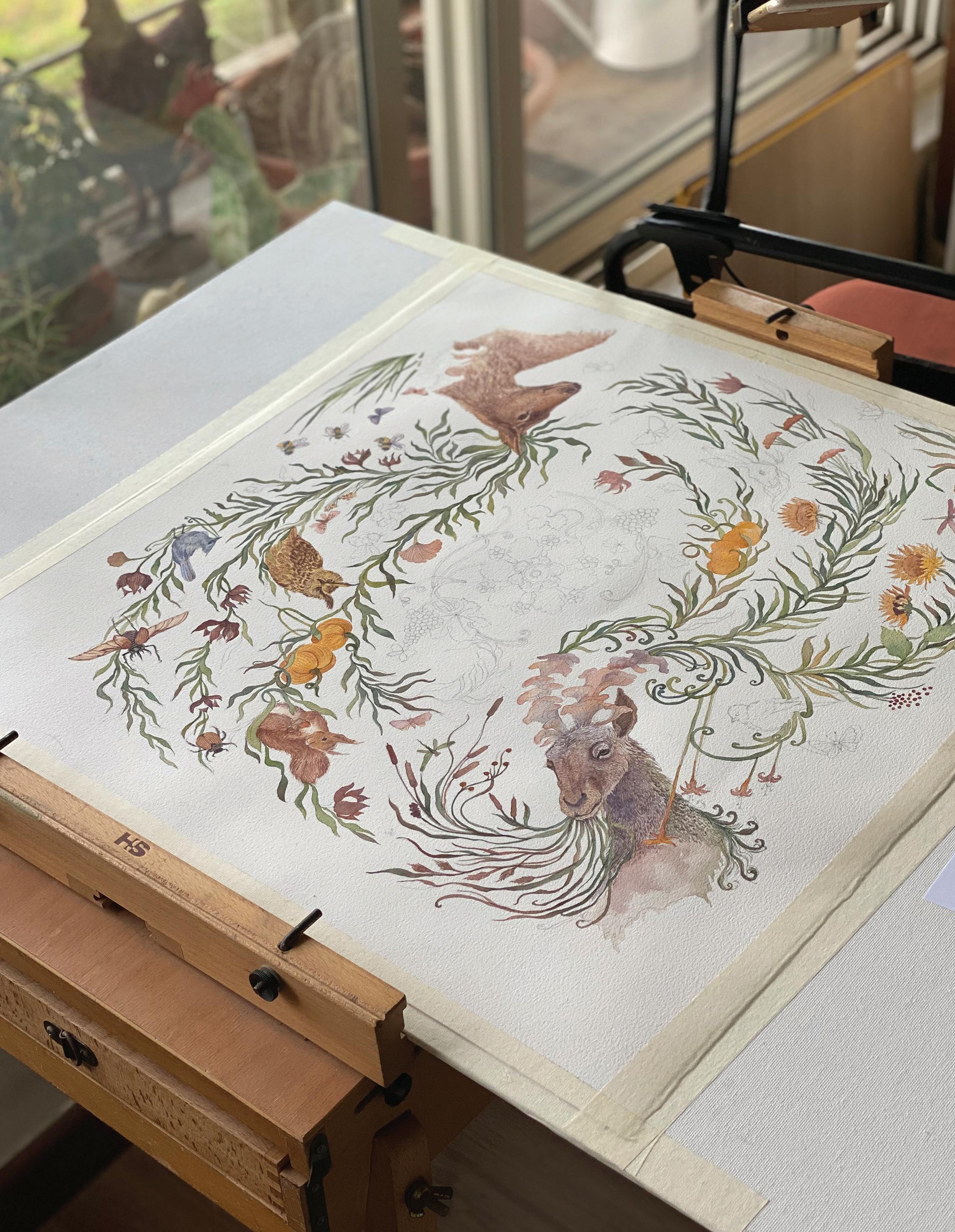 My art, much like my journey, continues to evolve. What began as whimsical animal portraits has grown into a body of work that explores the delicate balance between nature and imagination, flora that curl into feathers, beasts that bloom into flowers, and small fables that whisper through color and texture. My process remains intuitive and layered with curiosity, rooted in my lifelong fascination with the natural world. The studio has become a cabinet of curiosities in itself, filled with seed pods, coral fragments, feathers, and dried leaves that often find their way into my compositions.