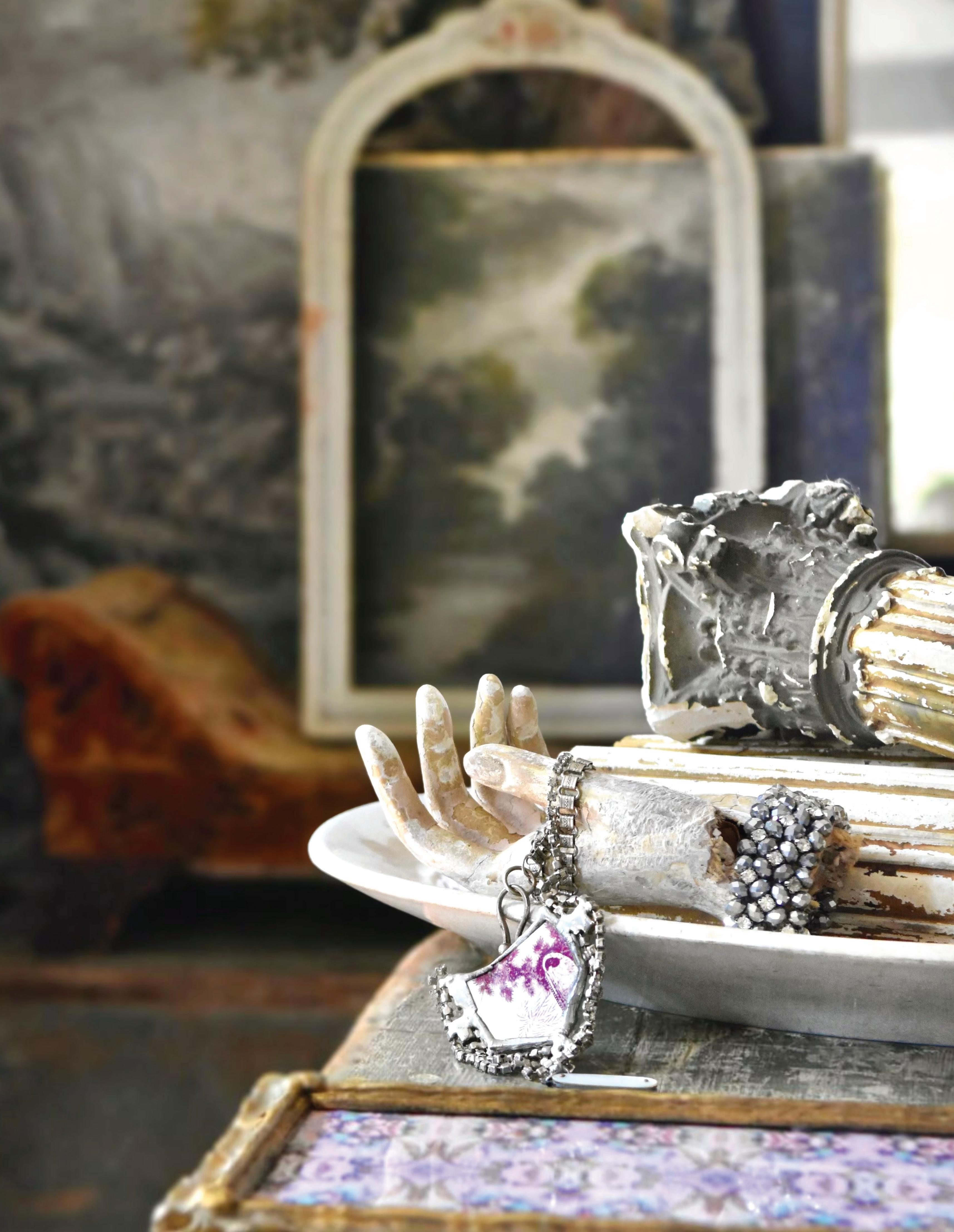 Props, some hand-painted, some old and chipped, velvets, and other bits of inspiration move about constantly like little actors acting as my muse.