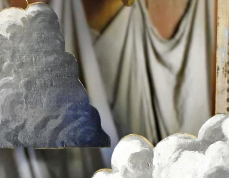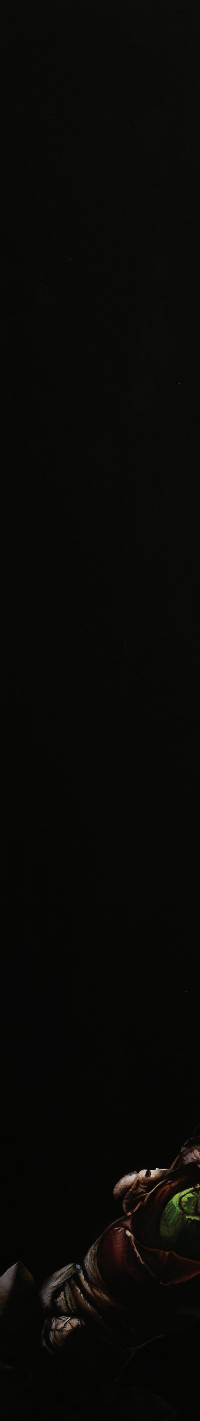 a bit more attention, not just in detail but also spatially. I often work on them in small sections and fragments lying flat on a surface, which can make it challenging to see the painting as a whole. Other times, I work on them while they’re hanging up to see where to place composition. There is no rhyme or reason; just what works best in the moment.
