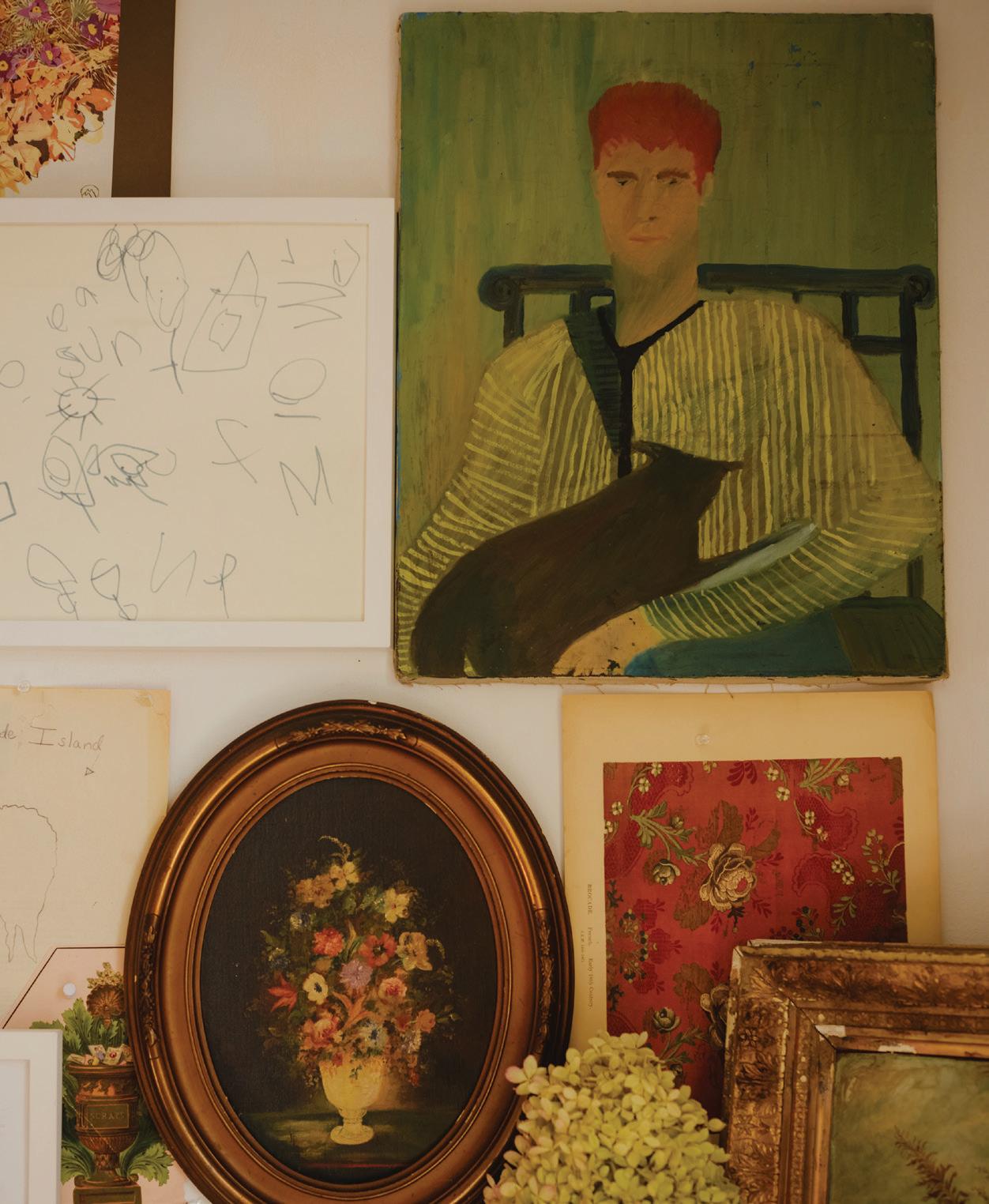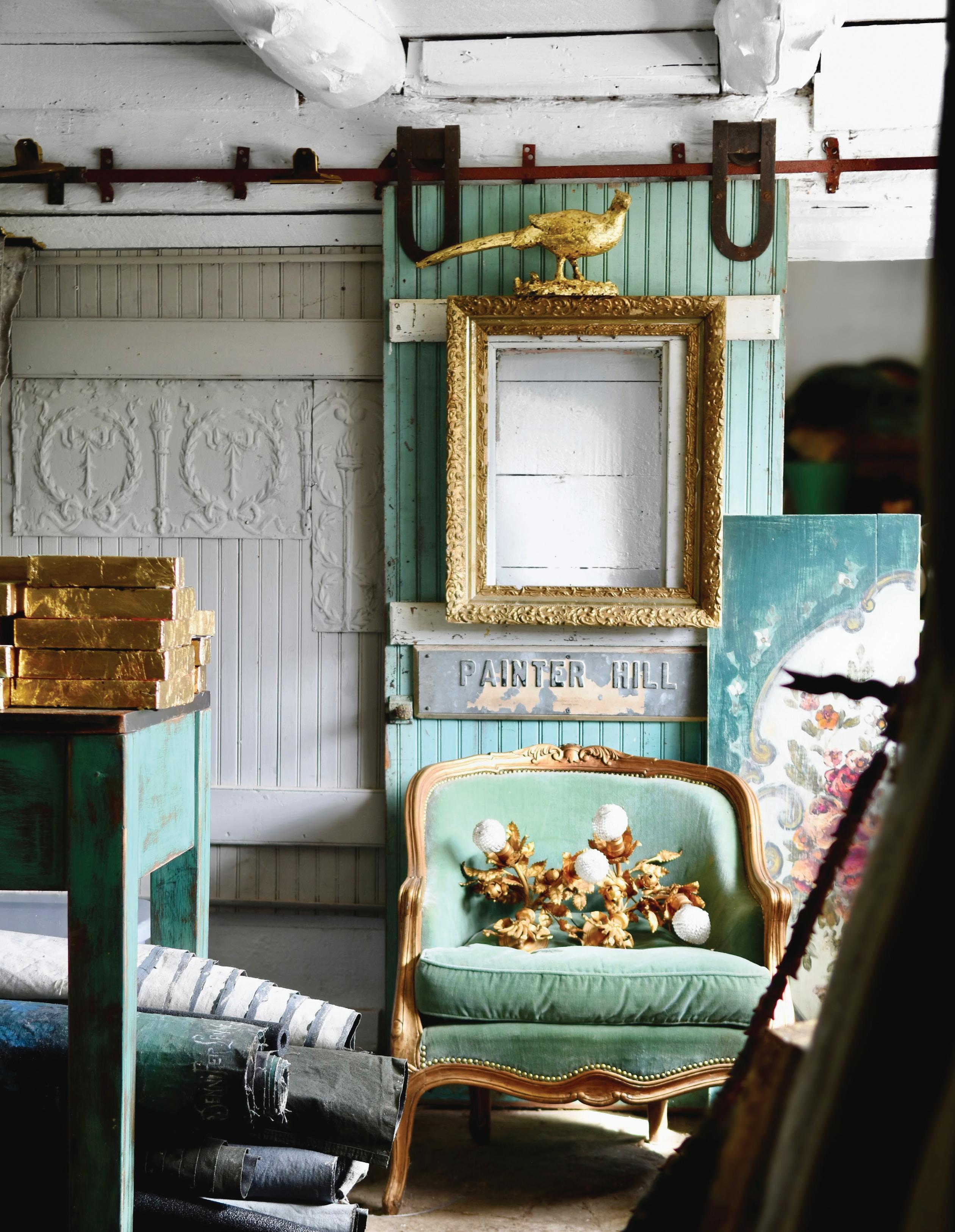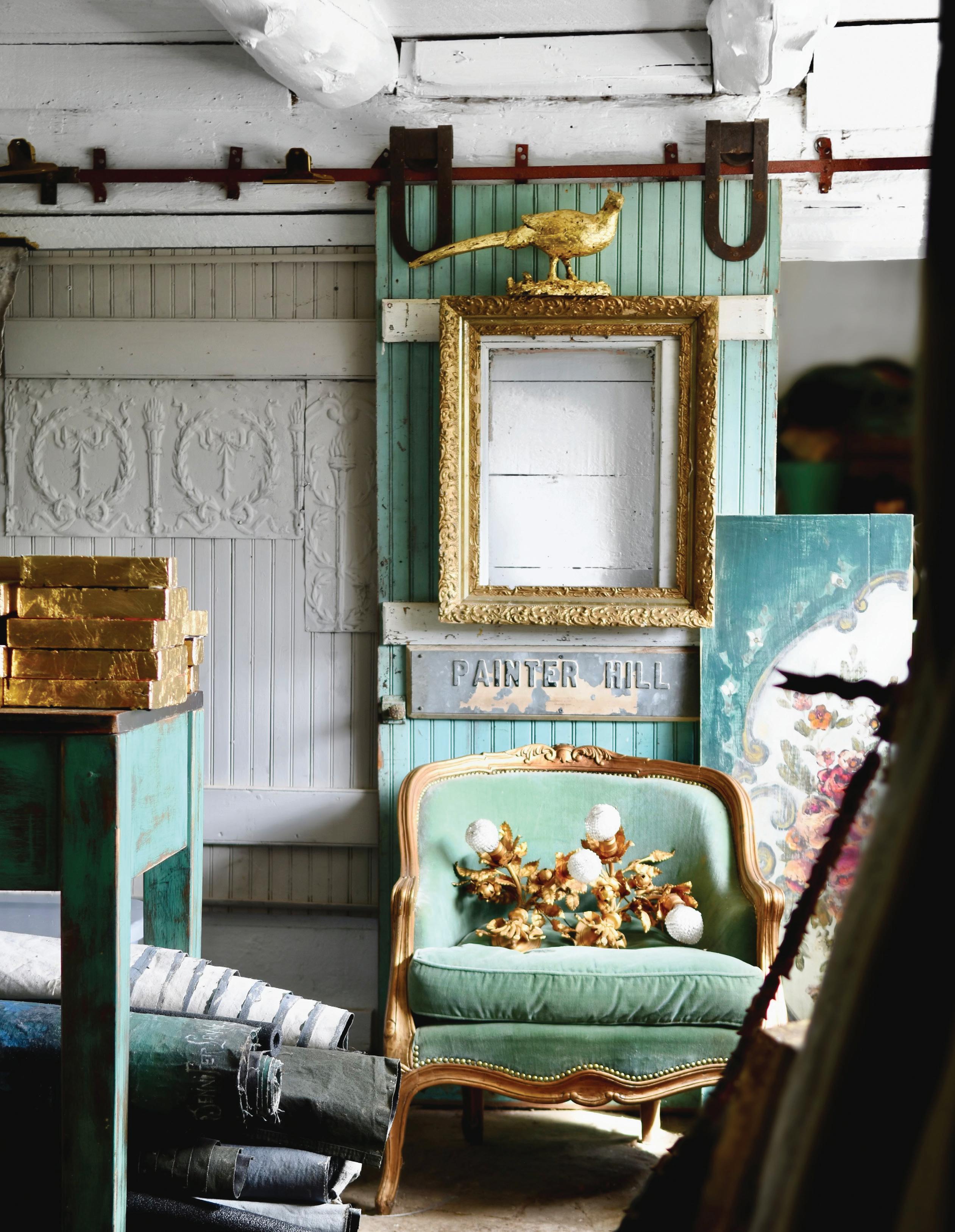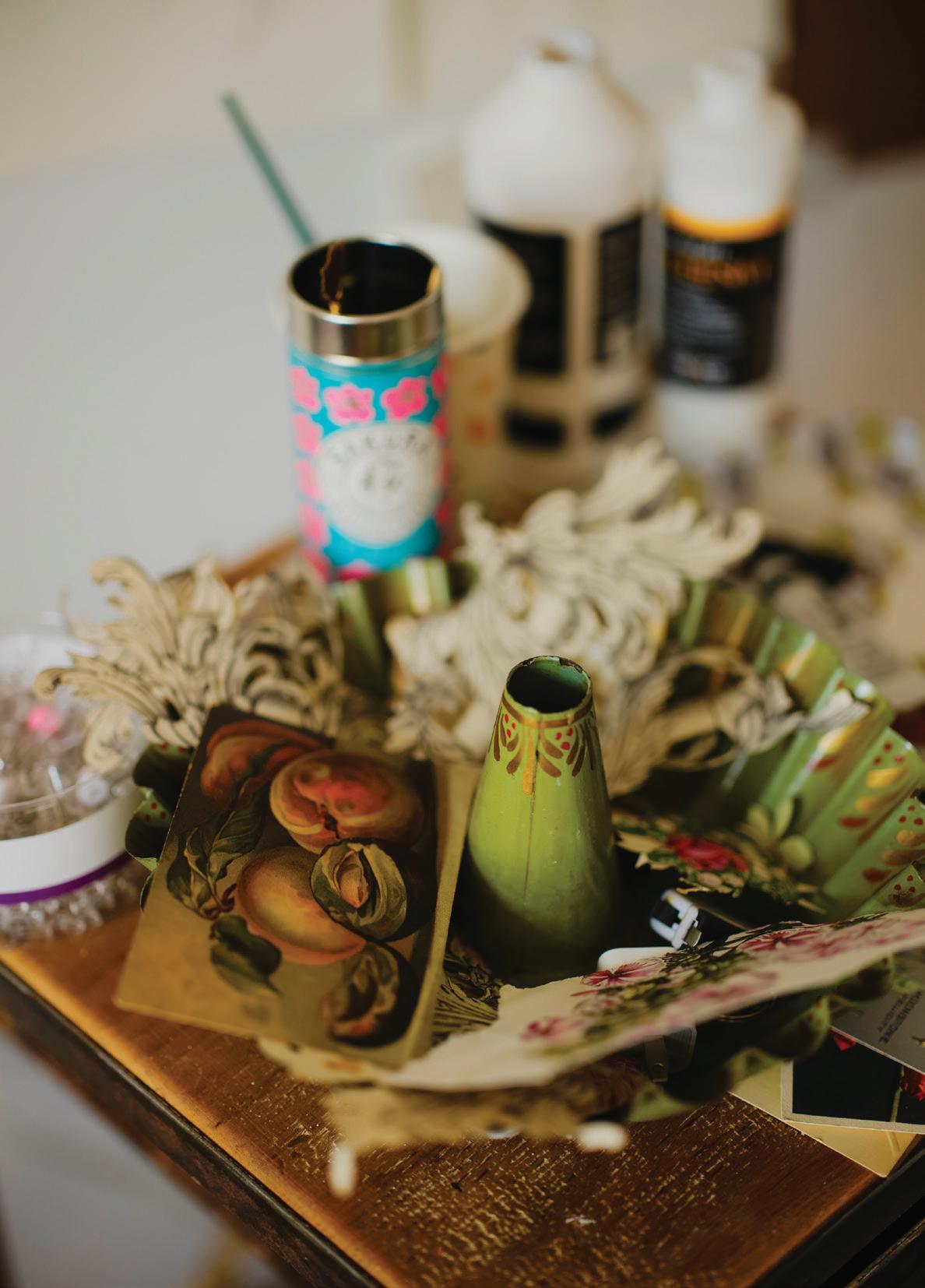 Ilike the idea of not thinking too much about painting. I rarely map anything out ahead of time. The knowing can feel restrictive—the mystery of where things are headed is part of the fun. The unknown ending allows me to paint on a lark. When not in the studio, I am out gathering ideas and vintage finds. I rarely search for