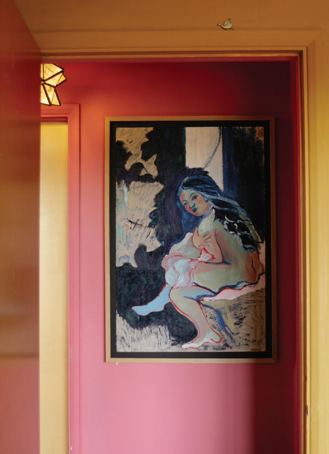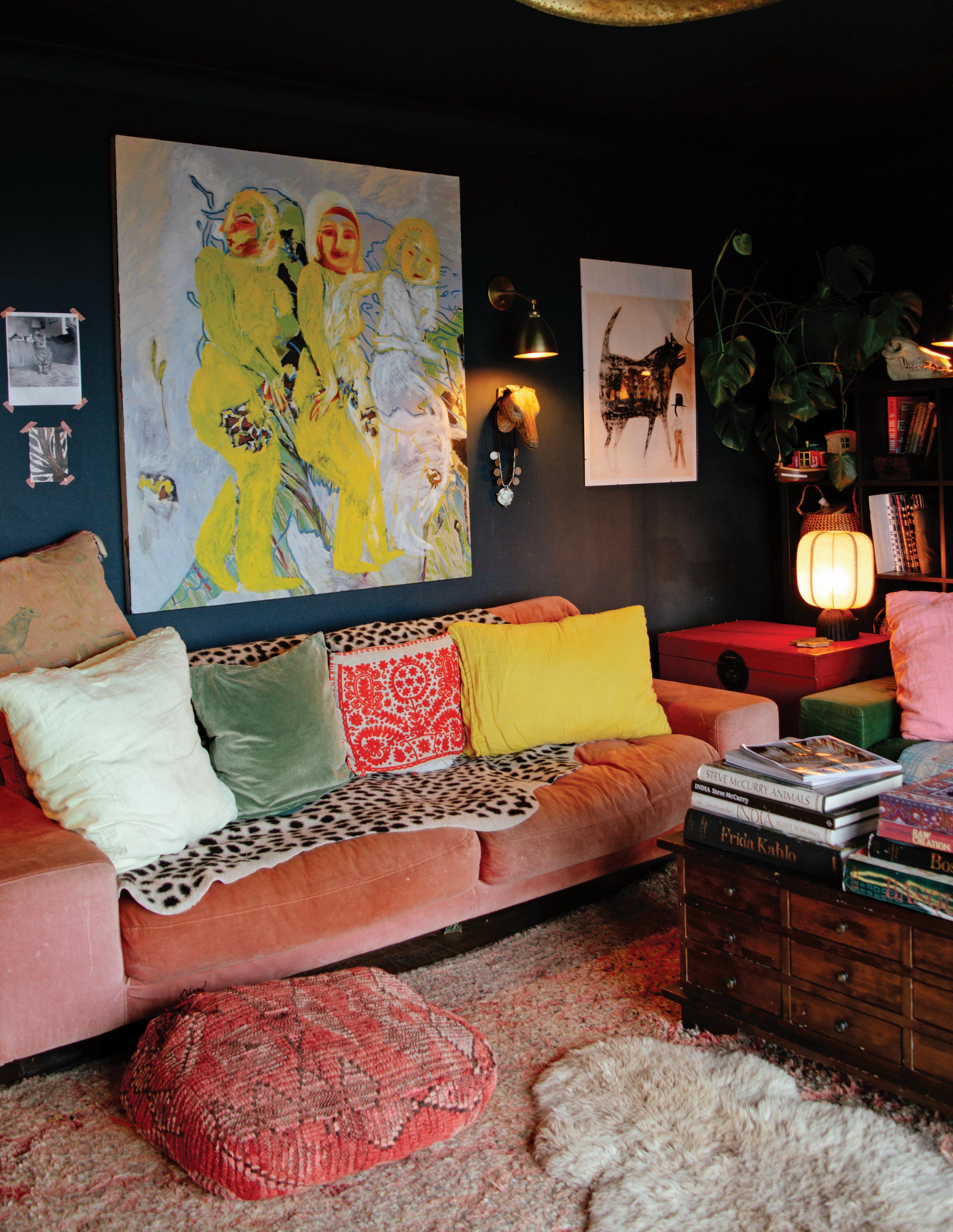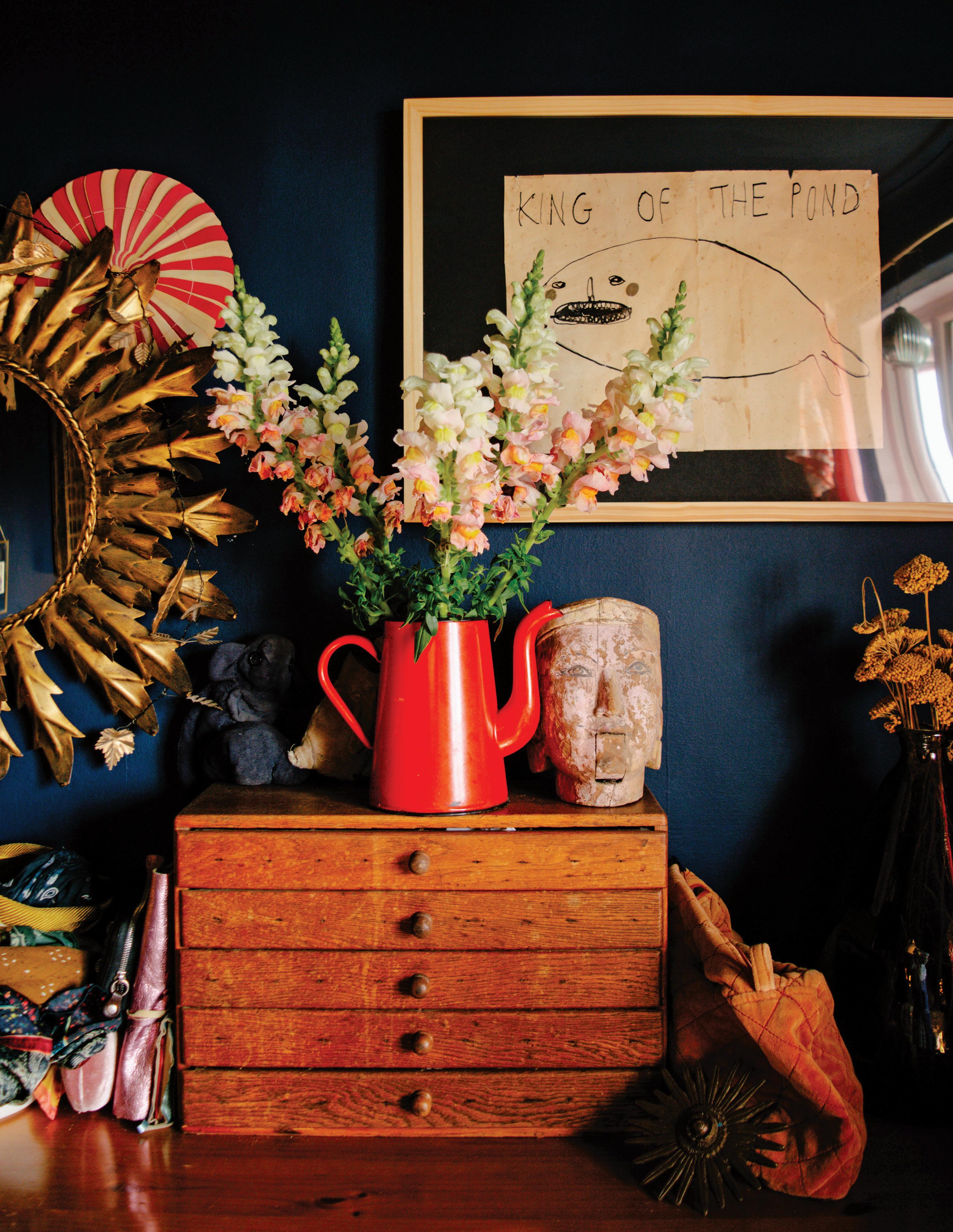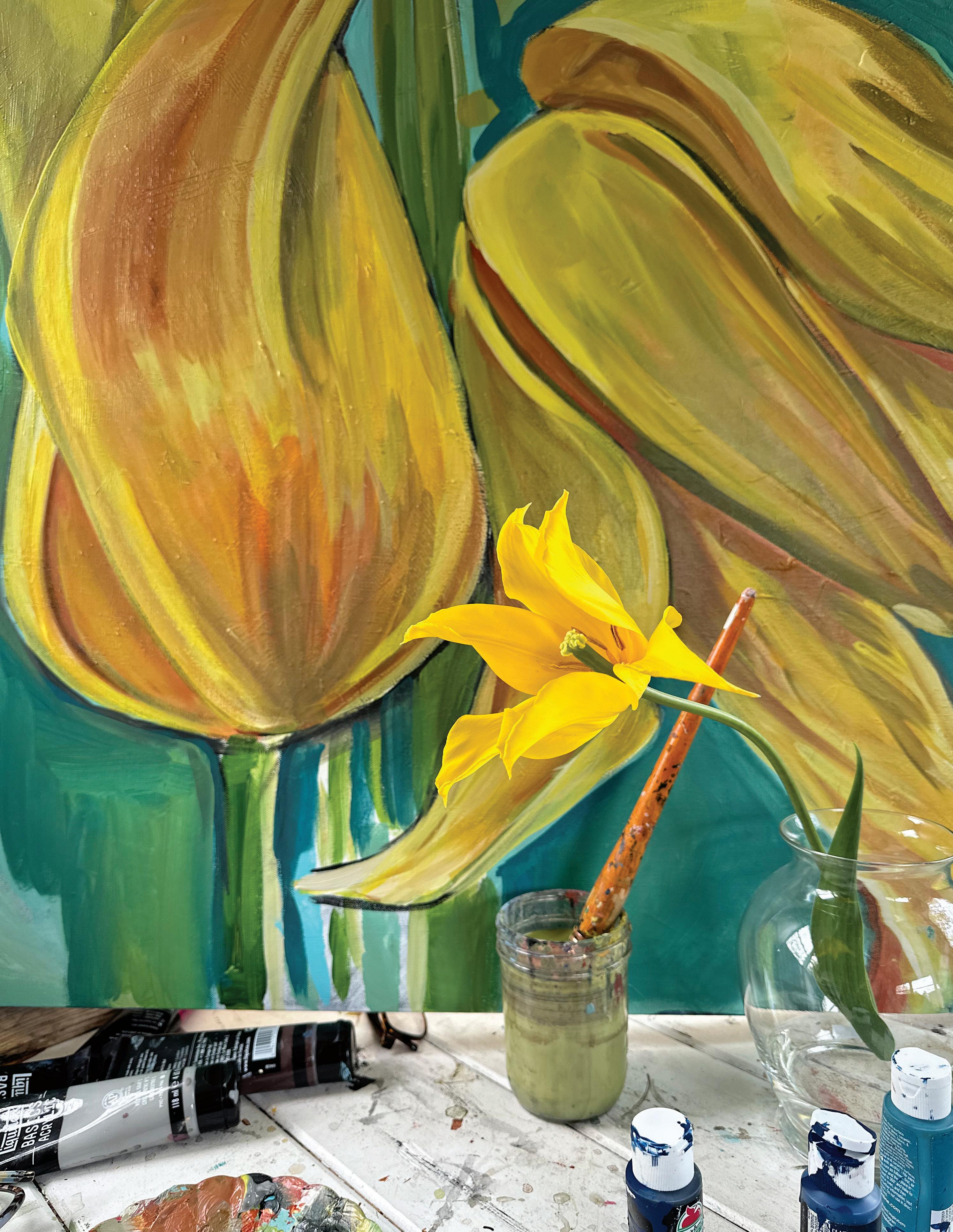 Ilike the idea of not thinking too much about painting. I rarely map anything out ahead of time. The knowing can feel restrictive—the mystery of where things are headed is part of the fun. The unknown ending allows me to paint on a lark. When not in the studio, I am out gathering ideas and vintage finds. I rarely search for