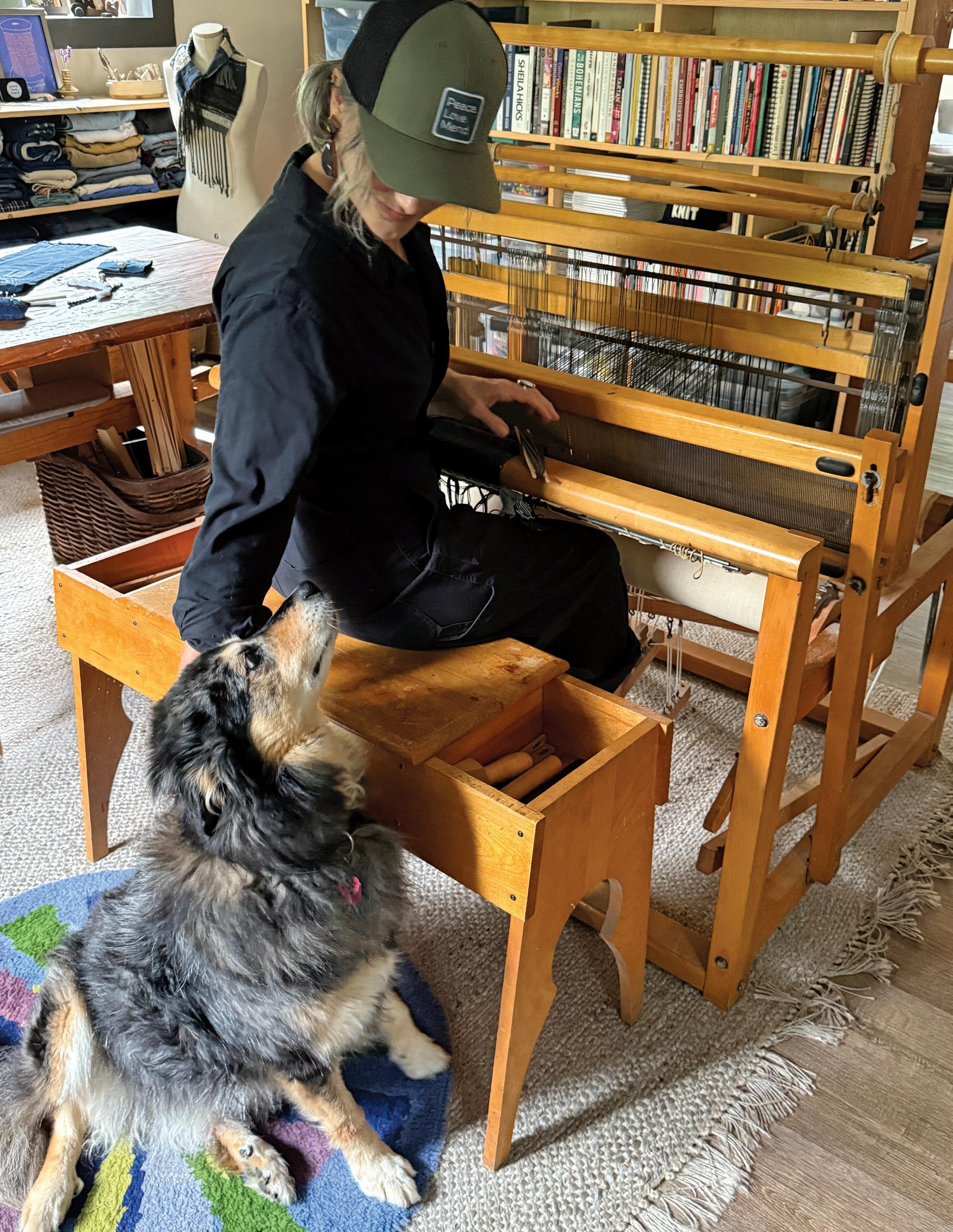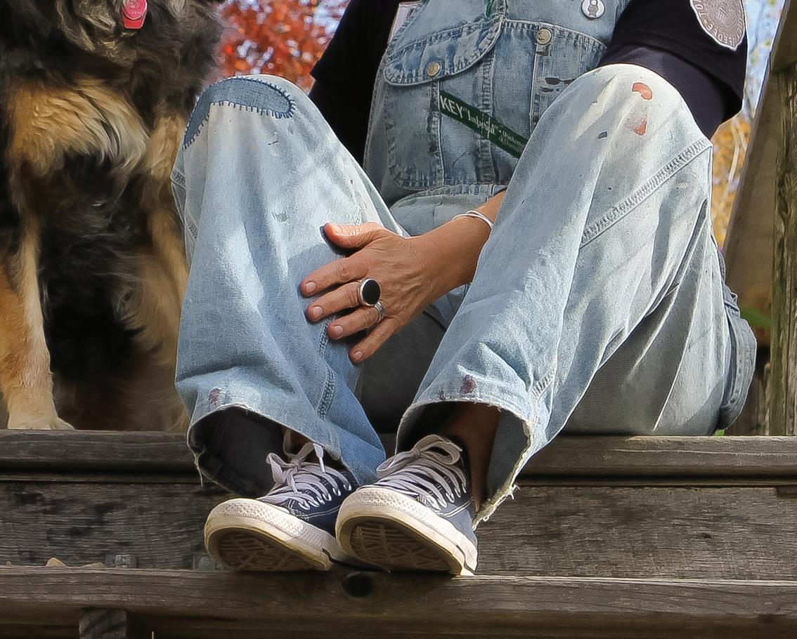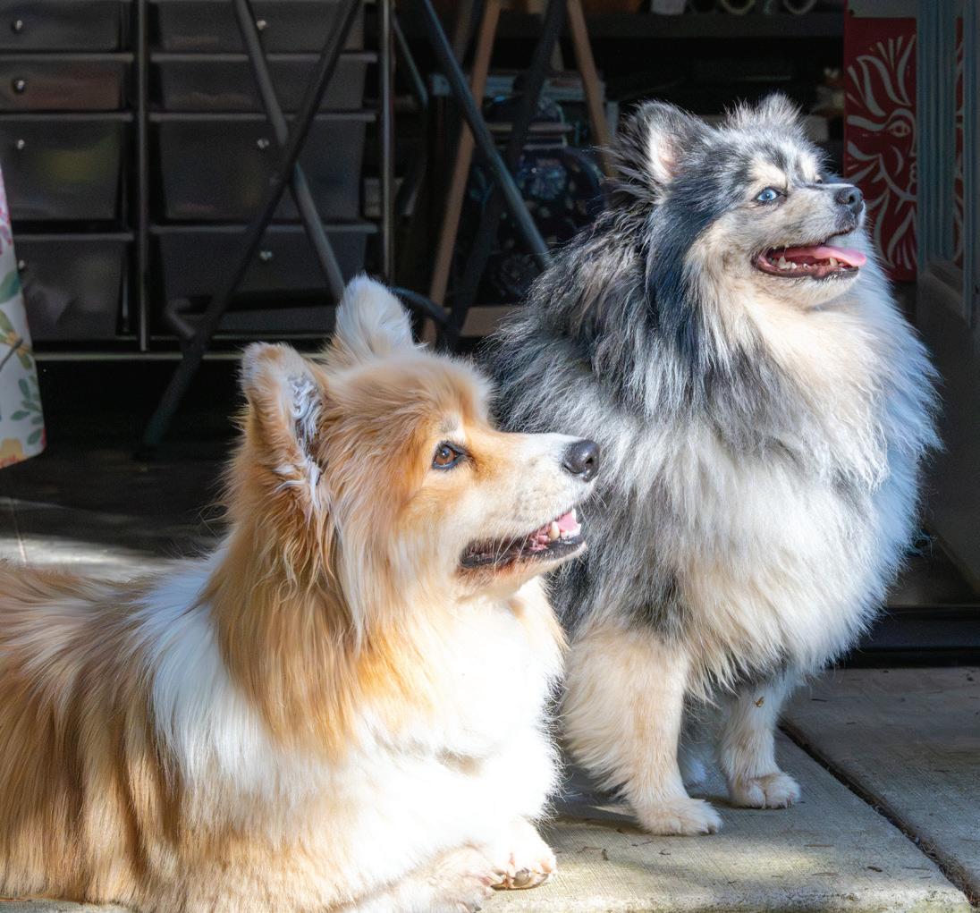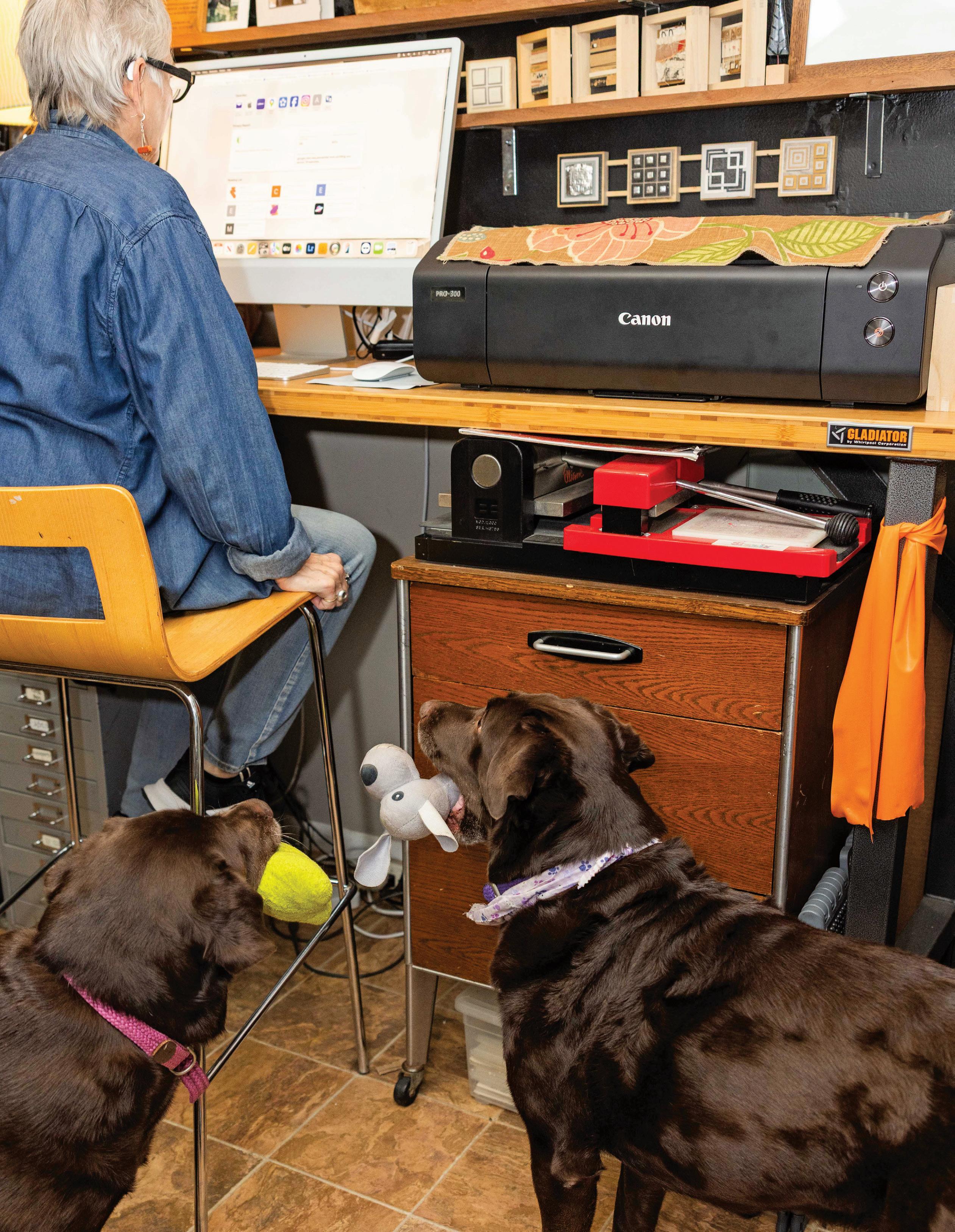 A few years later, I retired. This new freedom—where time holds no restrictions— let me spend hours completely immersed in exploring and creating new work. Now, the only interruptions occur when I’m eating, and our nine-year-old Betty Lou (named after my mom) and seven-year-old Mildred (after Gary’s grandma) suddenly appear on either side of me. Betty whines and Millie drools. Or, when Millie needs to go outside, but the back door is closed, she nudges the bells hanging from the doorknob to alert me that I’ve forgotten to open it. Betty needs reassurance—and a little coaxing—that she can still make it up the three steps into the kitchen.