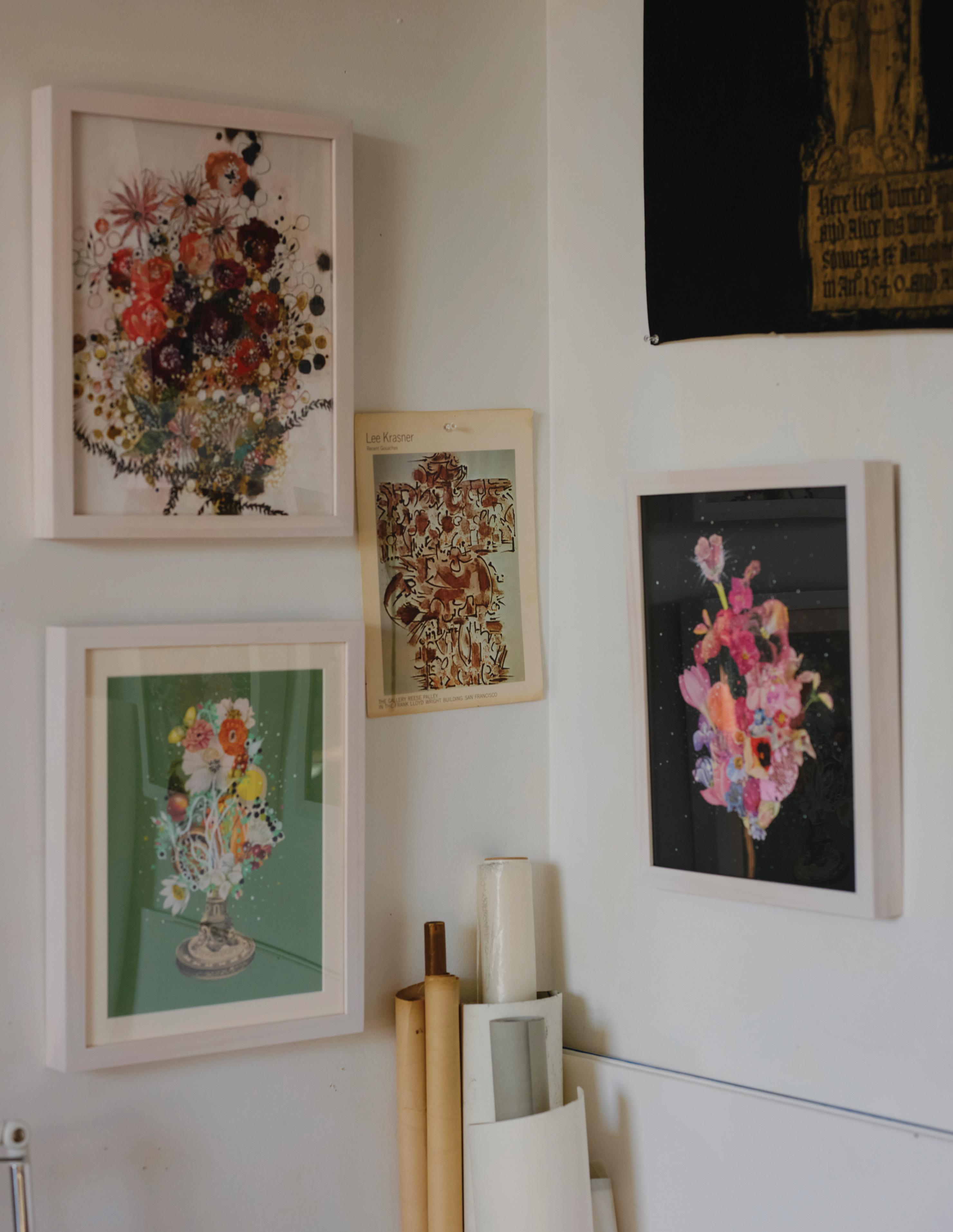 I think the very best thing about my studio is that it feels like I get to see the story of my life every time I walk into it. I revisit the places I’ve lived or visited and just dream of going to, and see the people I love or have lost or just wish I had gotten to meet. I see flashes of the art that inspires me, such as the work of Eva Hesse, Joan Snyder, Giorgio Morandi, and Rachel Ruysch. I see my favorite colors (right now green-gold, violet, sunflower yellow, and pink), pretty stains of my favorite food (coffee!), and my favorite books (antique flower illustrations). And since one of my goals as an artist is to create work that asks the viewer to consider the past, present, and future lives of my subject matter all at once, it seems only fitting that I ask myself to do the same thing.