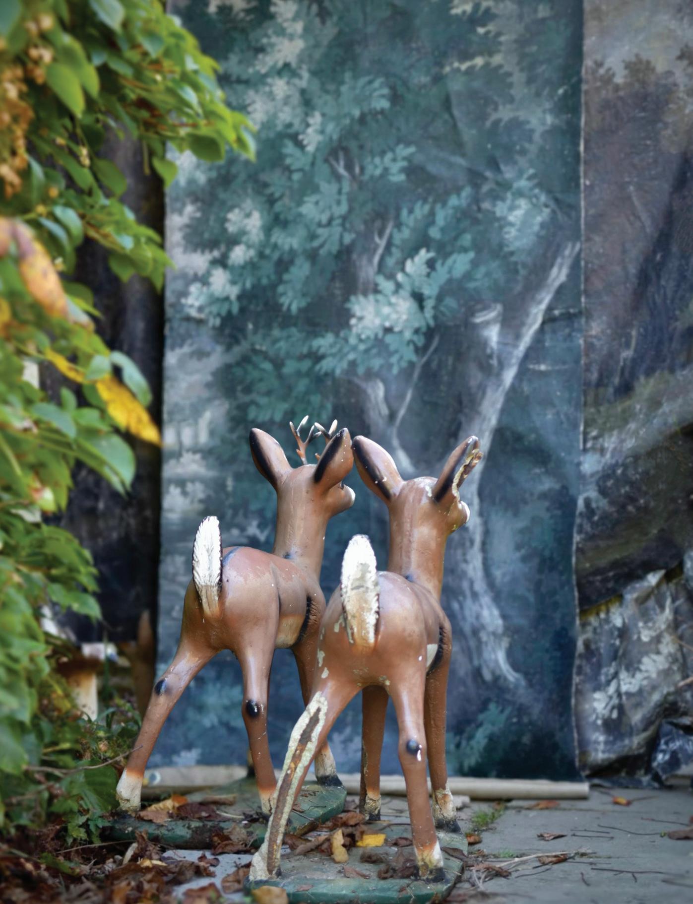 anything specific, just what catches my eye. A broken plaster piece, a peeling bit of wallpaper, a chipped vase, a disheveled chair—all add to the story. Sometimes I drag these finds along with artwork out in the barn, into a pasture, or even a stream, letting nature play a role. Light, trees, shadows, and the haze of the background all have a part in the performance.