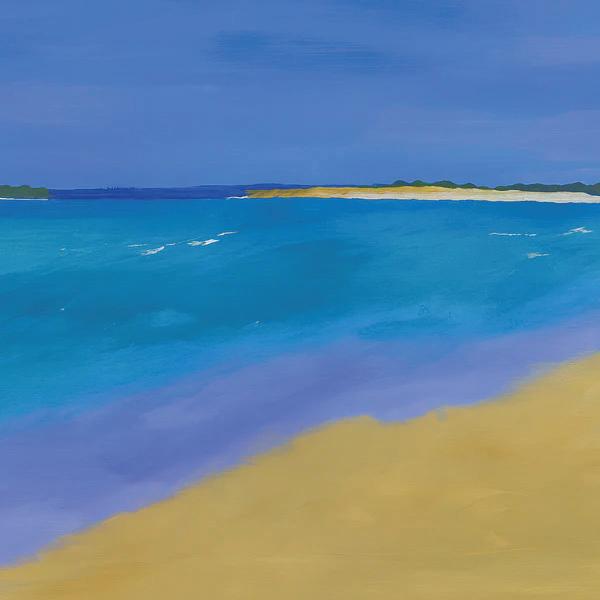 Vibrant shades of blue depict a serene ocean scene with gentle waves and a distant shoreline. The sky transitions from deep to lighter hues, indicating a calm atmosphere.