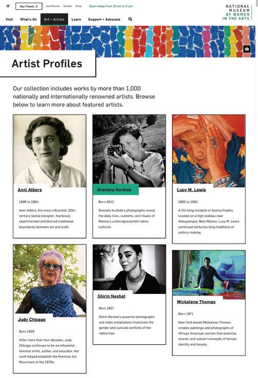 NMWA’s events and programs are back in full swing. Please join us in the renovated museum to enjoy a tour, make art, meet friends after hours, and so much more. Check out the full calendar beginning on page 14.