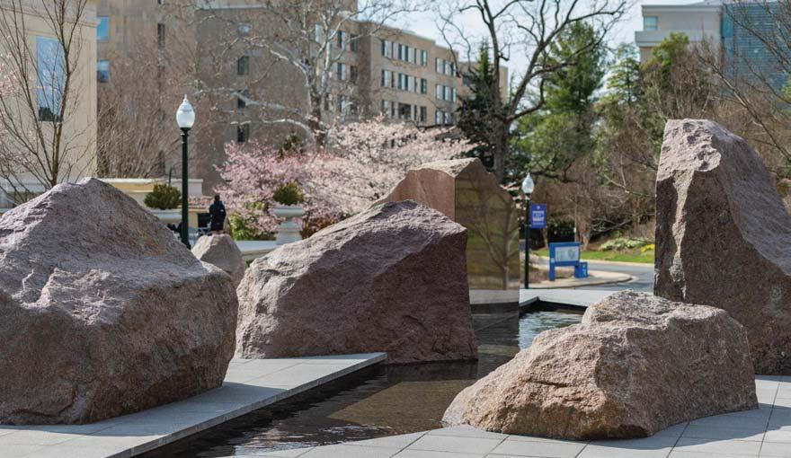 Marabar (1984), a 450,000pound sculpture by artist Elyn Zimmerman (b. 1945) has found a new home—and name— at American University. The work was originally installed in the courtyard of the National Geographic Society in Washington, D.C., but plans for a renovation prompted its move. Now titled Sudama, and reconfigured for the new space, the sculpture comprises five granite boulders positioned around a crescent-shaped reflecting pool. Jack Rasmussen, director of the American University Museum at the Katzen Arts Center, noted the work’s place in the history of Land Art. “This was a major, ambitious installation. Women artists just didn’t get commissions like this at that time.”